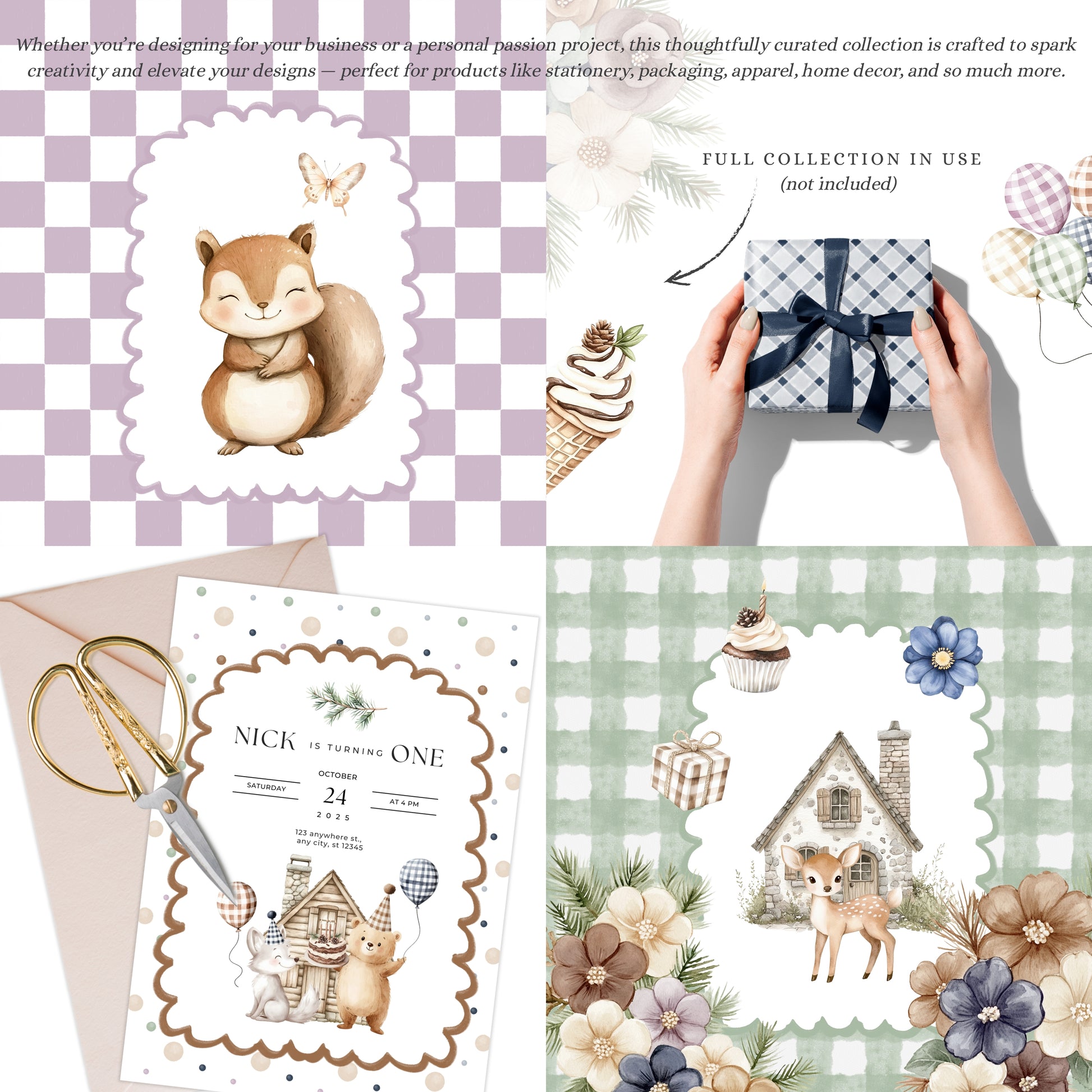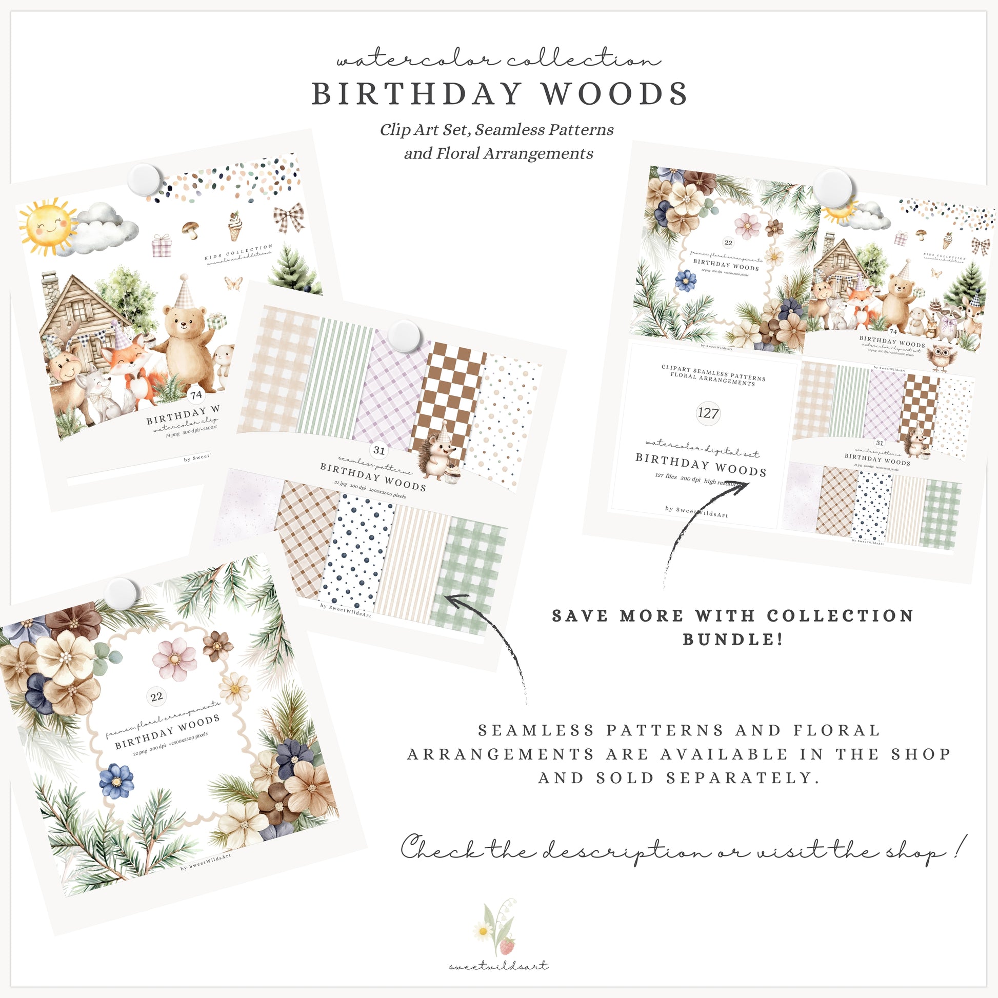 Birthday Woods - Seamless Patterns, Woodland Gingham Polka Dot Stripes | 31 JPEG