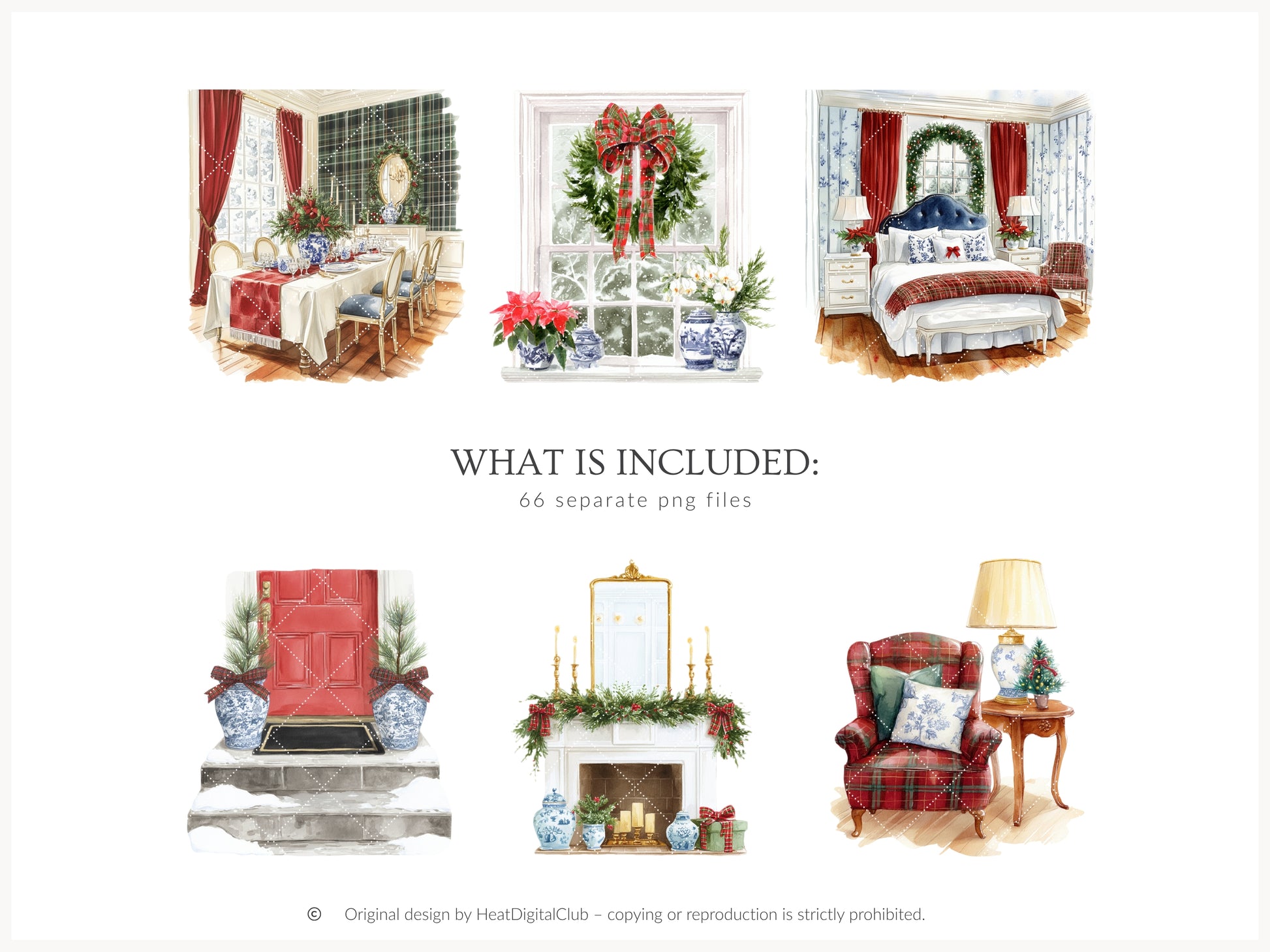 Chinoiserie Holidays - Clipart Set, Christmas, Tartan, Elegant Grandmillennial Winter | 66 PNG