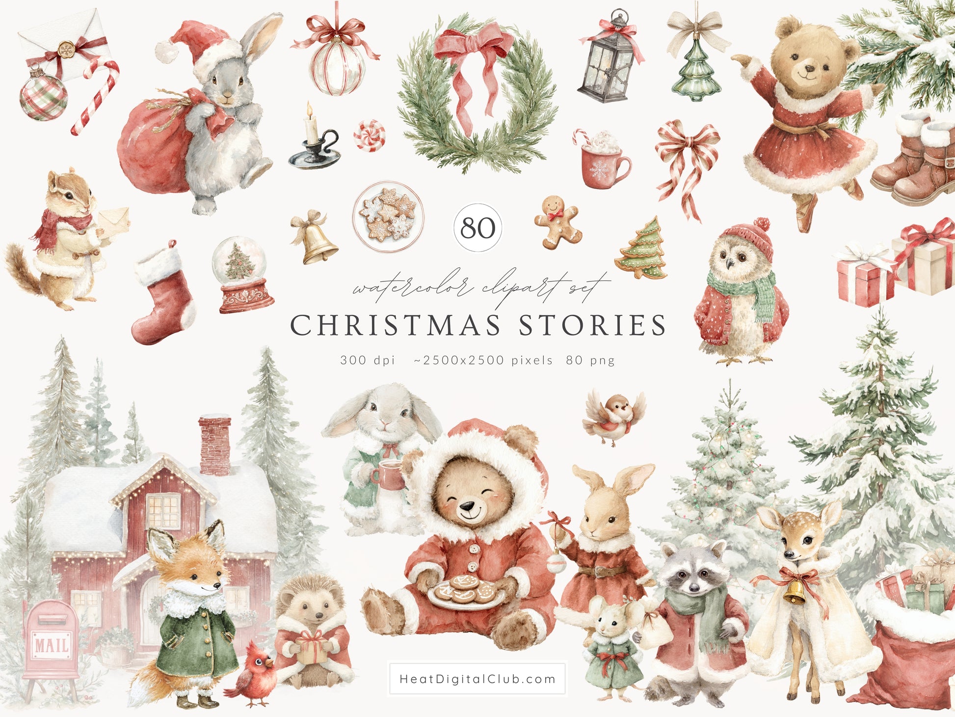 Christmas Stories - Clipart, Cute Xmas, Classic Holidays, Baby Animals, Woodland Santa | 80 PNG/JPEG