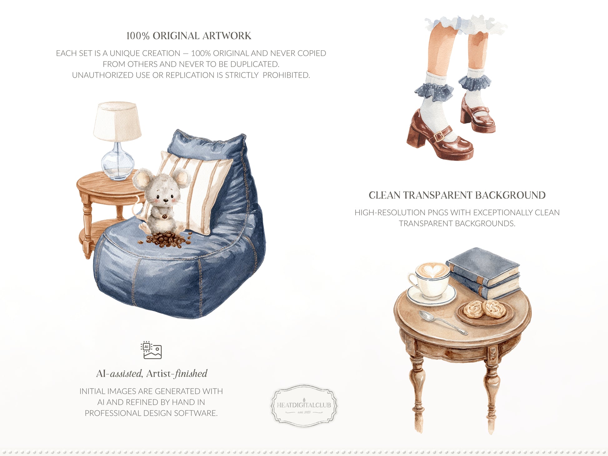 Bring your story to life with the Coffee & Denim clipart set — a curated selection of watercolor illustrations designed for creative freedom and visual charm. Perfect for everything from digital stickers to paper goods.