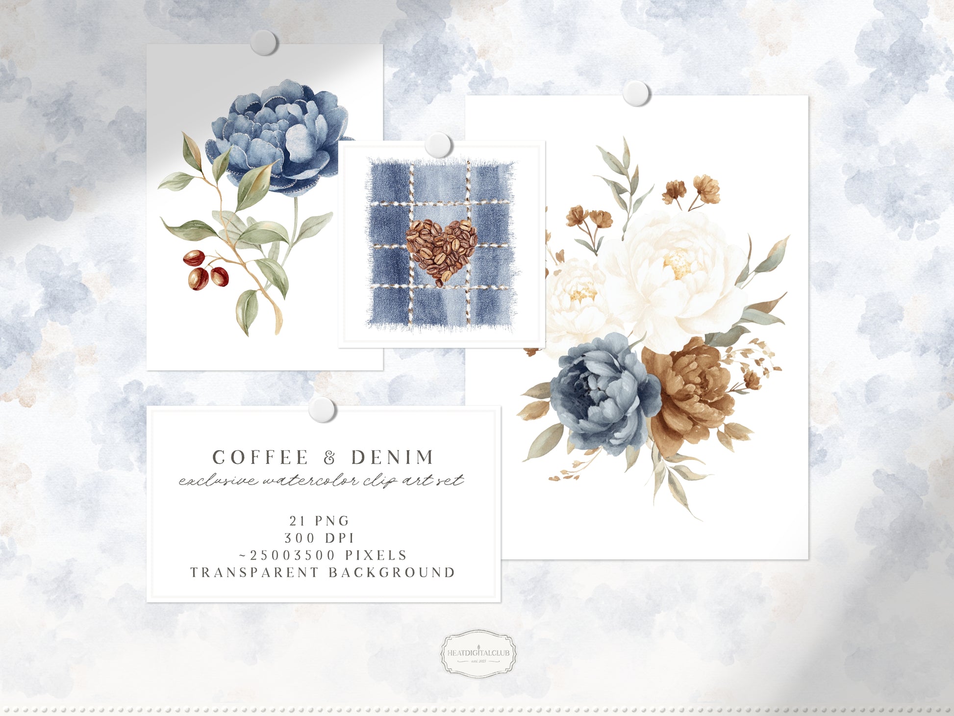 Capture delicate beauty with the Coffee & Denim floral compositions — watercolor bouquets perfect for soft, romantic projects.