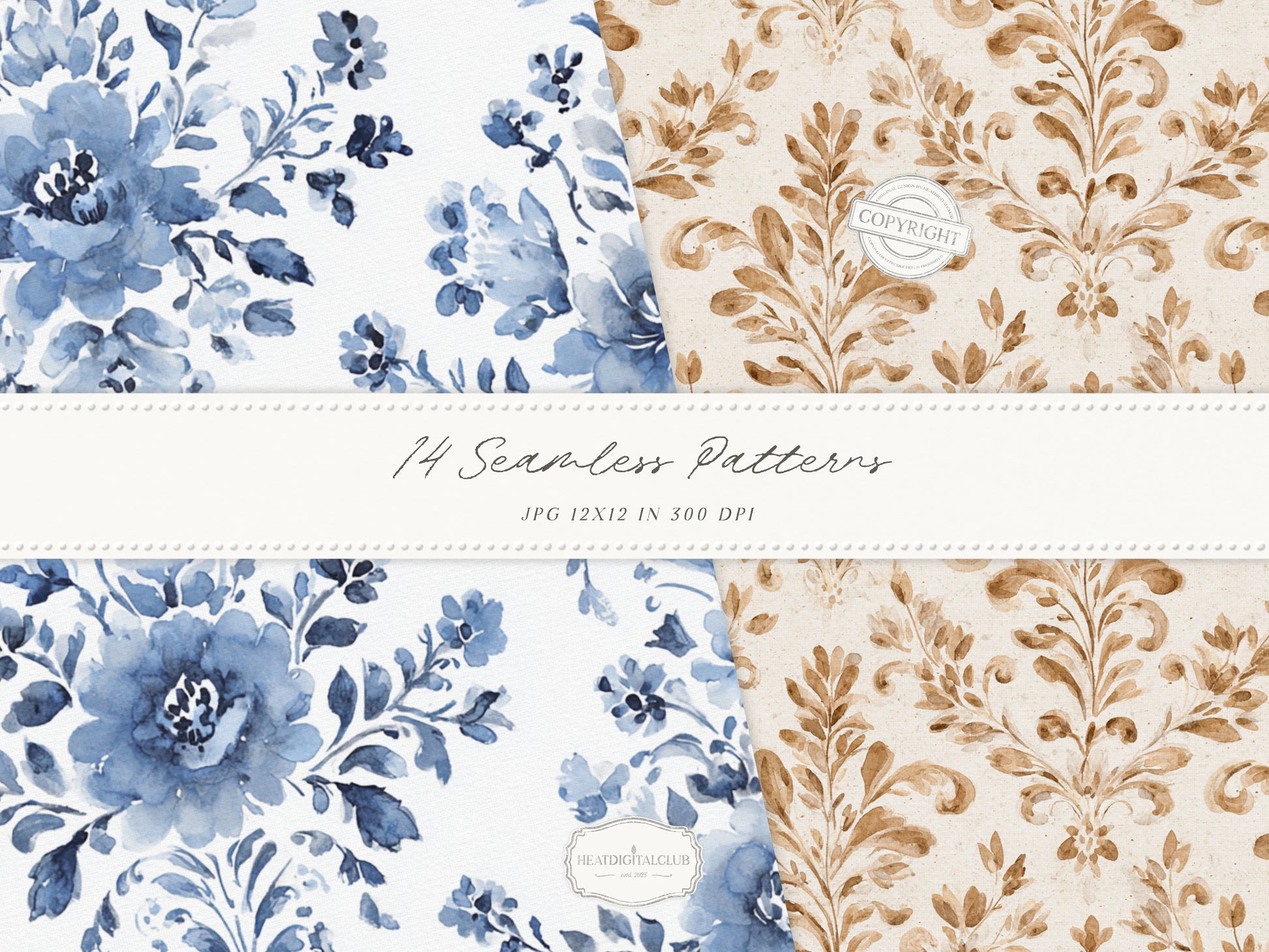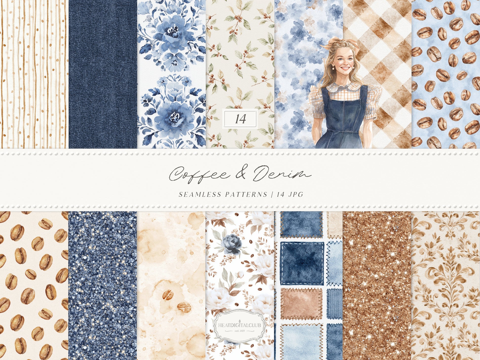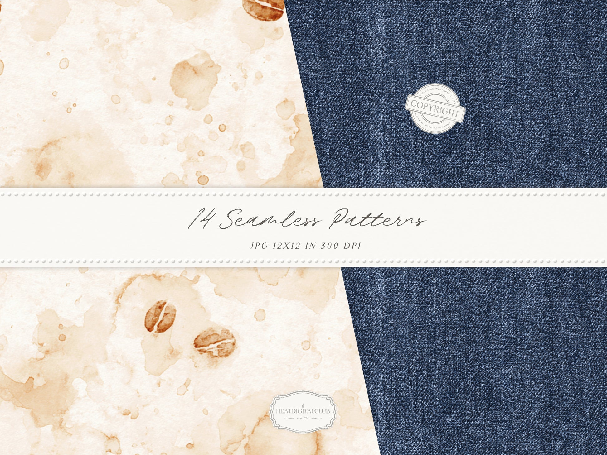 Add elegance and character with the Coffee & Denim seamless pattern collection — a versatile mix of timeless watercolor designs created to flow beautifully across any surface.