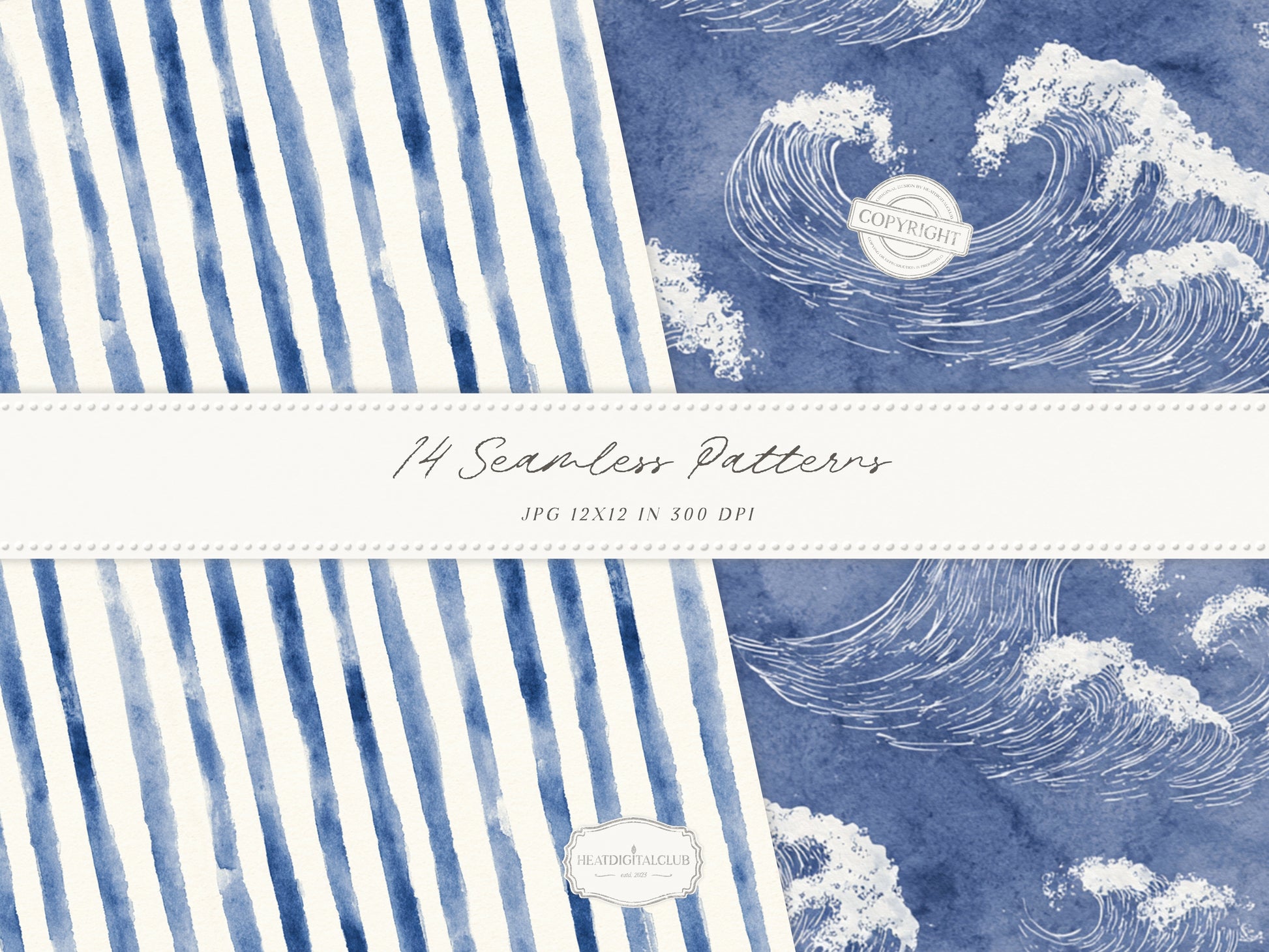 Cold Shore - Navy Seamless Patterns, Blue Stripe Coastal Design, Nautical Shell & Wave | 14 JPEG
