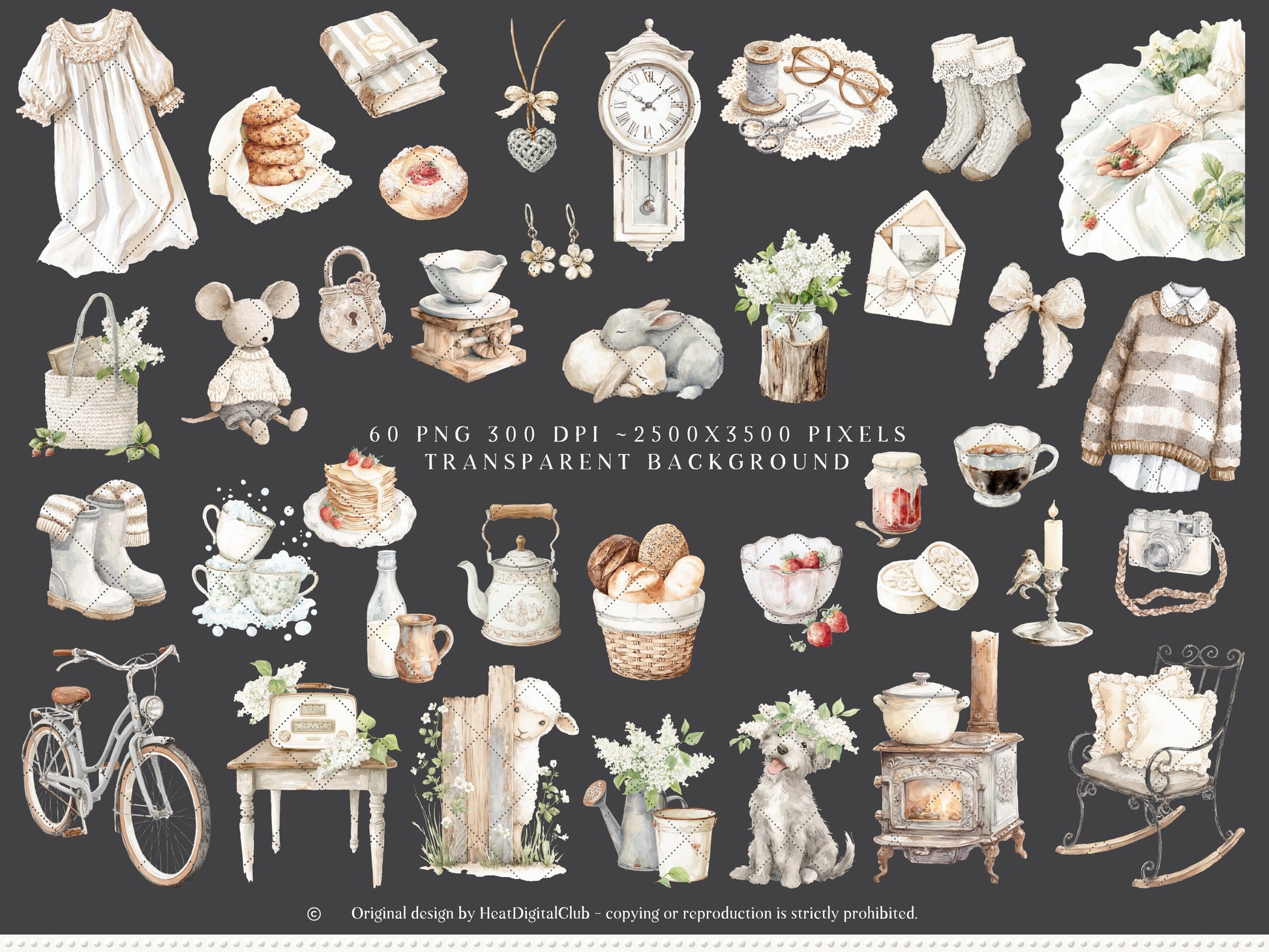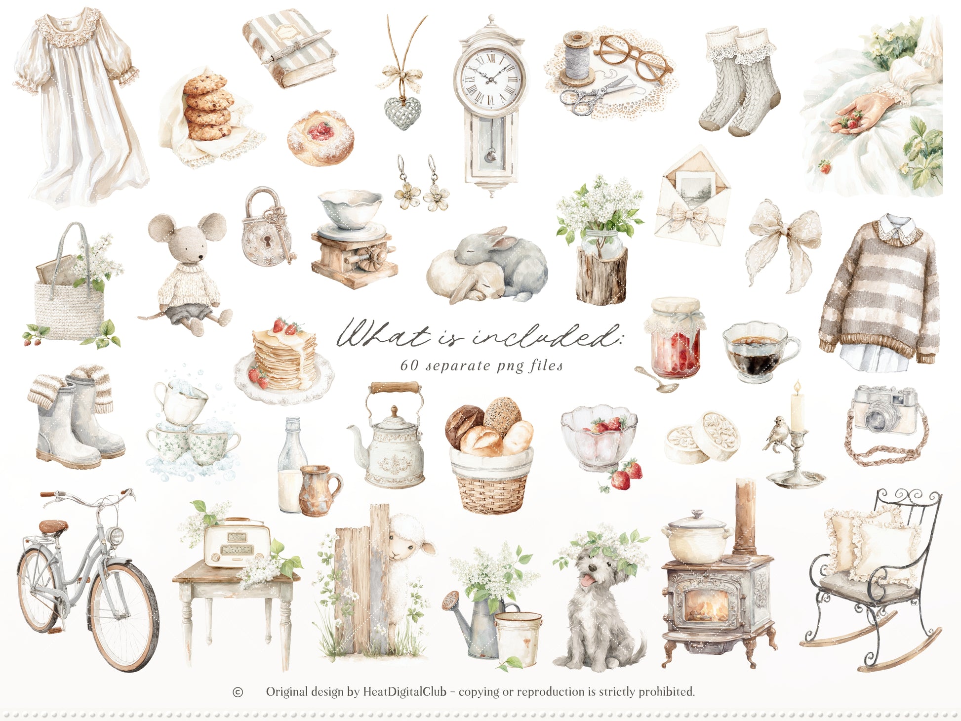 Country Spring - Bundle Clipart, Rustic Cottagecore, Strawberry Garden, French Farmhouse, Soft Neutral | 94 PNG/JPEG