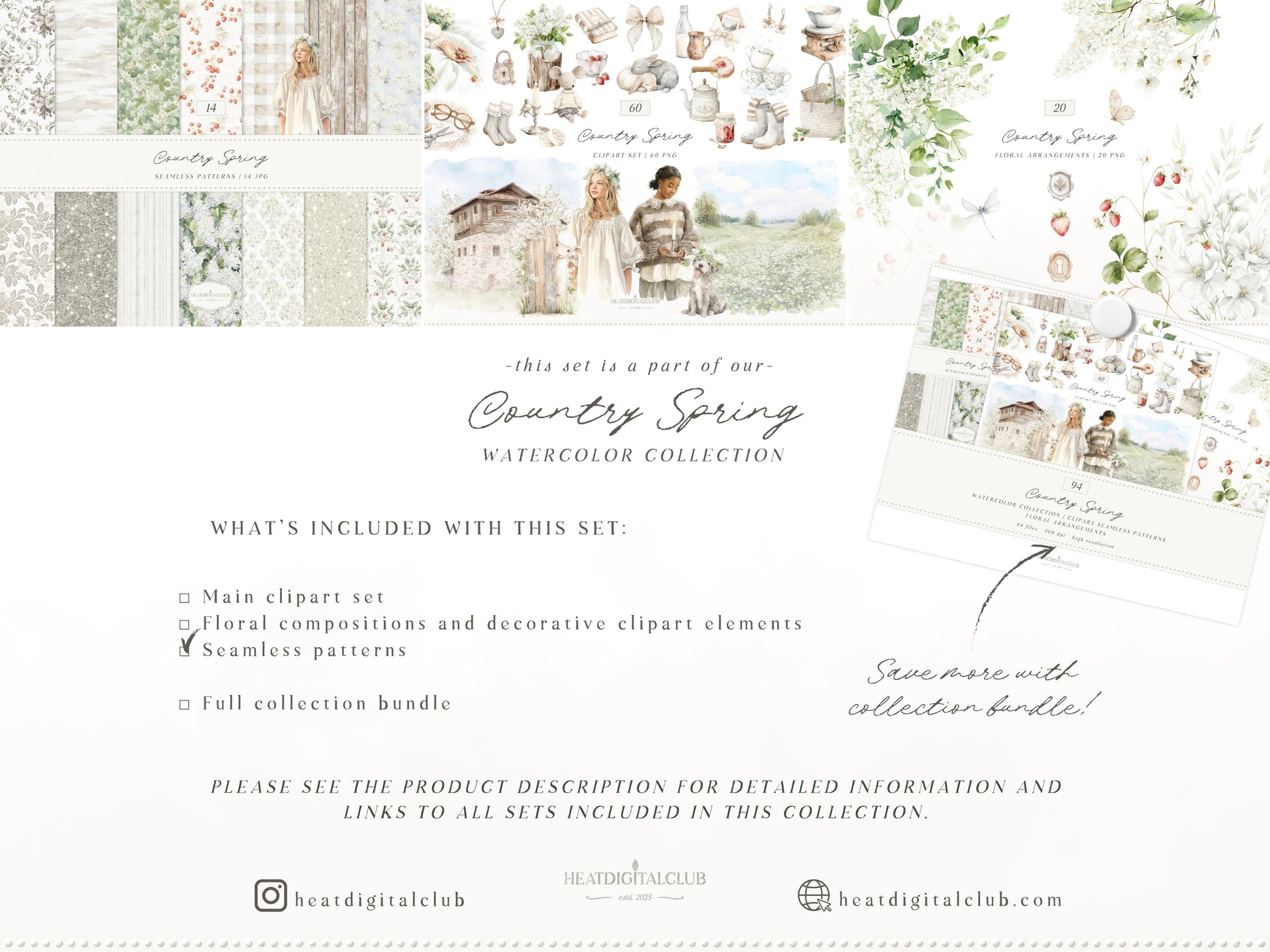 Add elegance and character with the Country Spring seamless pattern collection — a versatile mix of timeless watercolor designs created to flow beautifully across any surface.