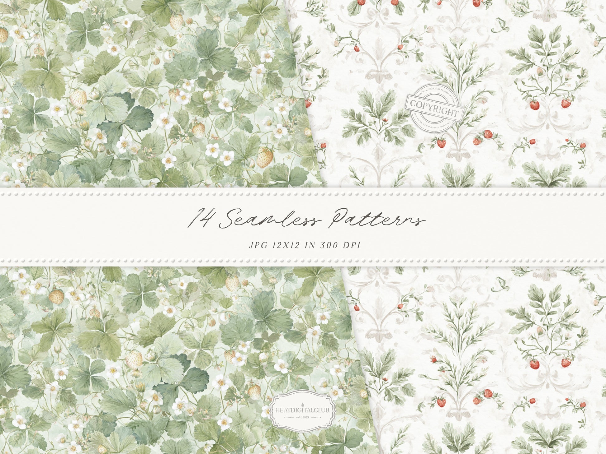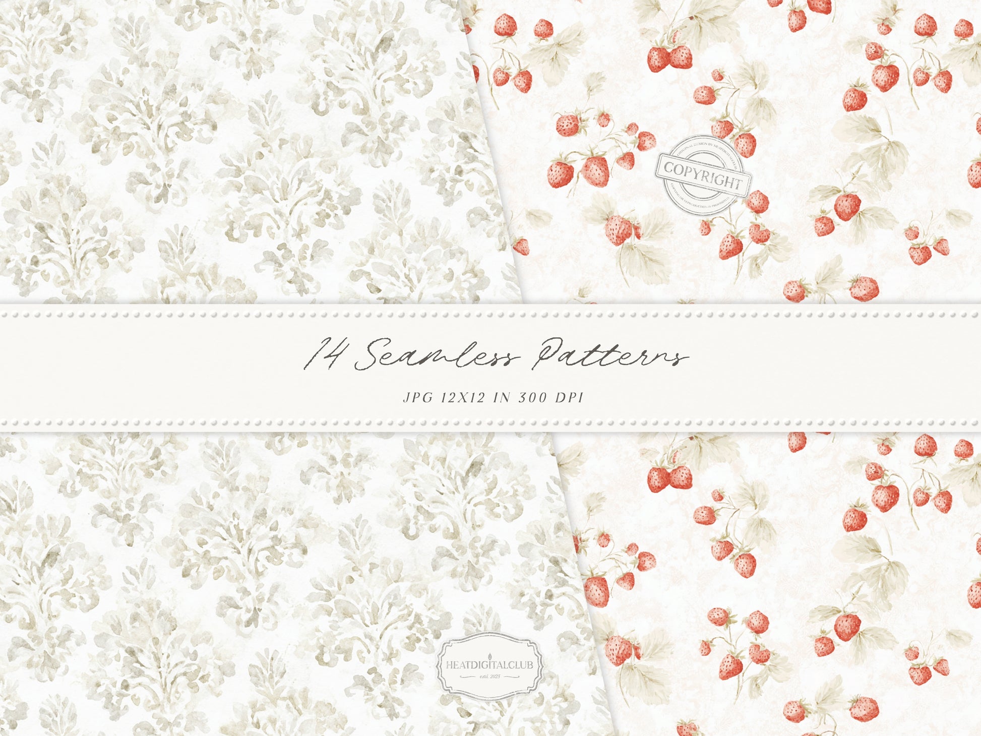 Country Spring - Seamless Patterns, Cottagecore, Strawberry & Lilac Prints, Rustic Neutral | 14 JPEG