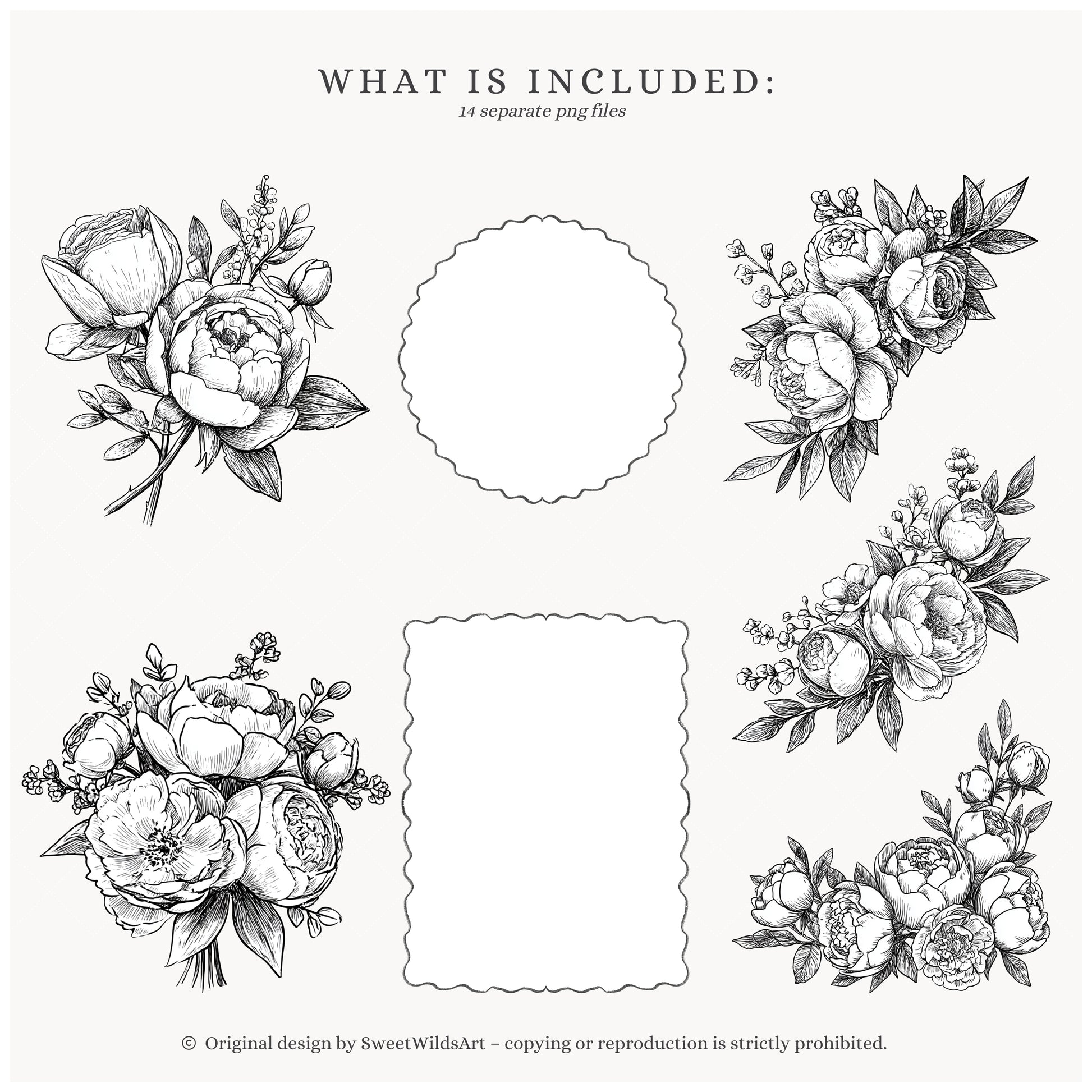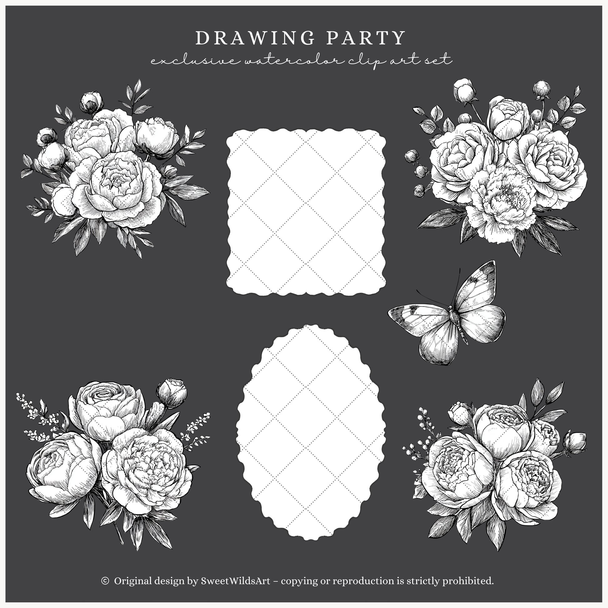Drawing Party - Floral Line Art, Flowers Clipart, Black and White Peony | 14 PNG