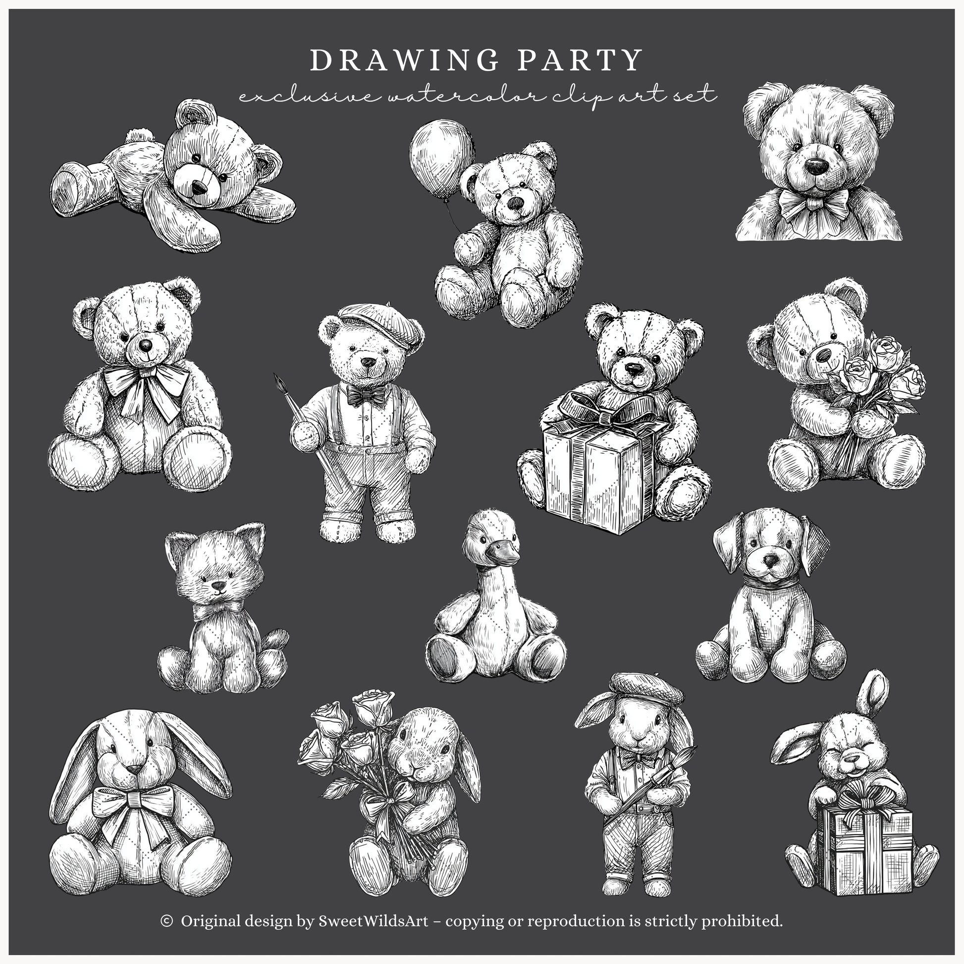Drawing Party - Line Art Clipart, Birthday Animals, Black and White Teddy Bear | 35 PNG