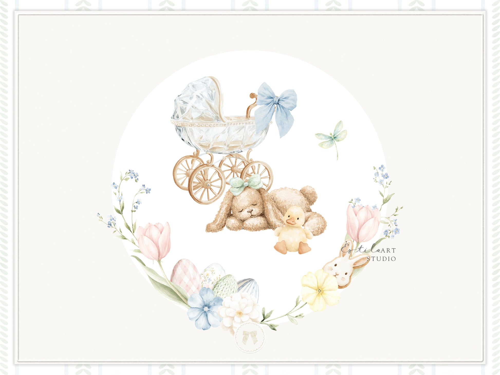 Easter Atelier - Clipart Set, Heirloom Nursery Easter, Plush Bunny Toys, Pastel Eggs | 117 PNG/JPEG