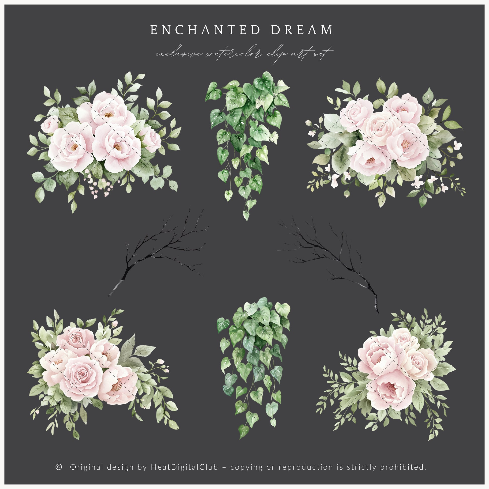 Capture delicate beauty with the Enchanted Dream floral compositions — watercolor bouquets perfect for soft, romantic projects.