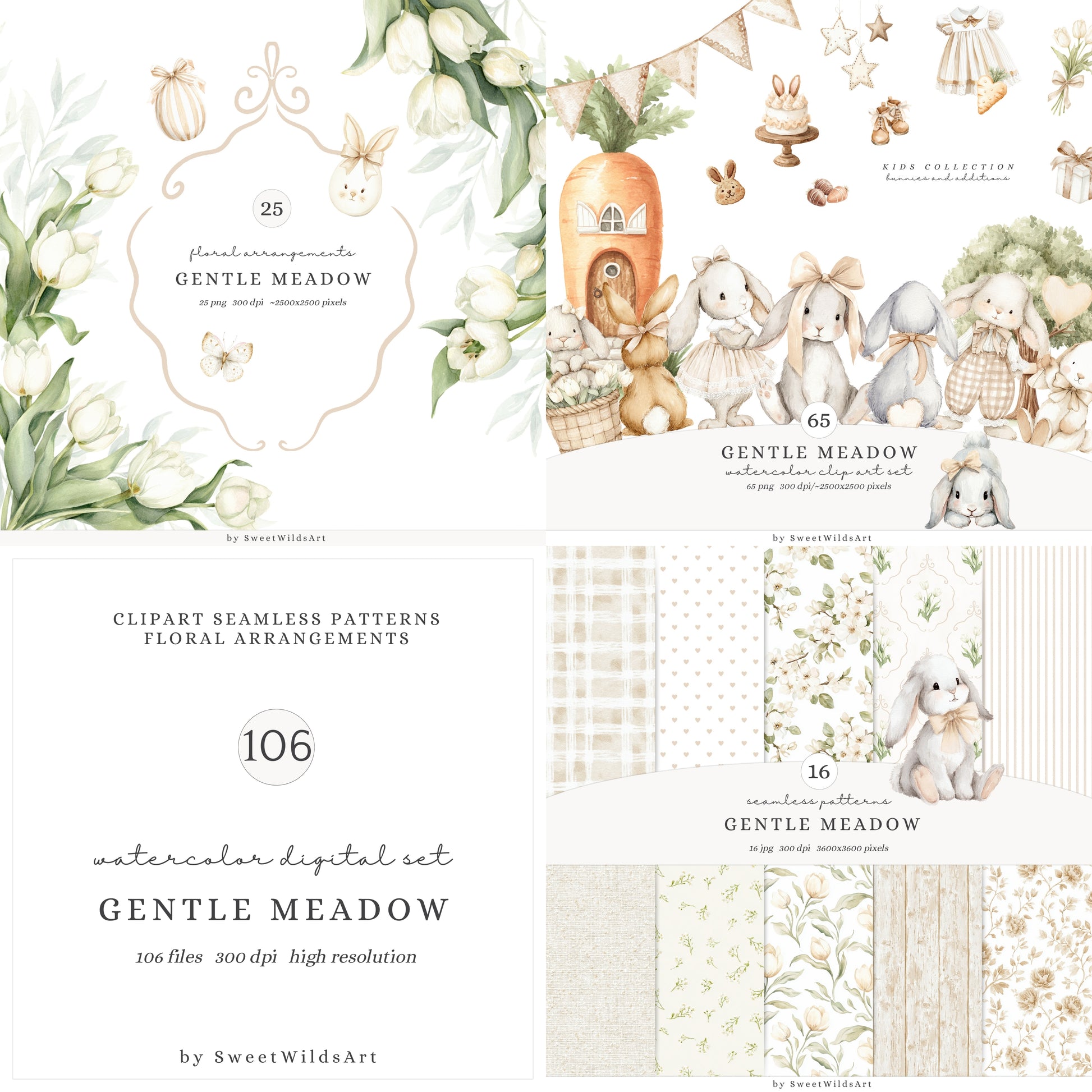 Gentle Meadow - Bundle Clipart, Easter Rabbits, Spring, Neutral Cottagecore, Baby Shower, Nursery | 106 PNG/JPEG