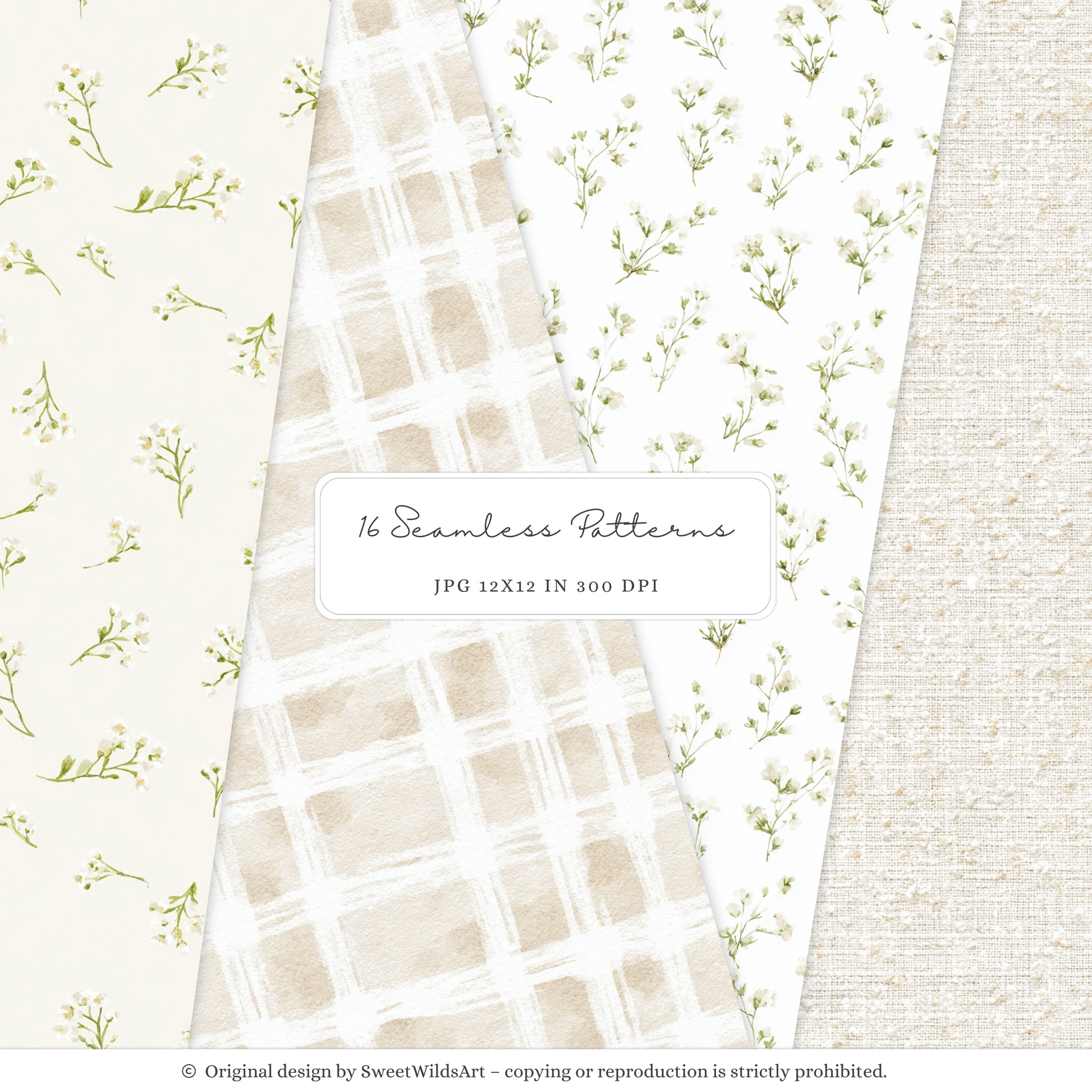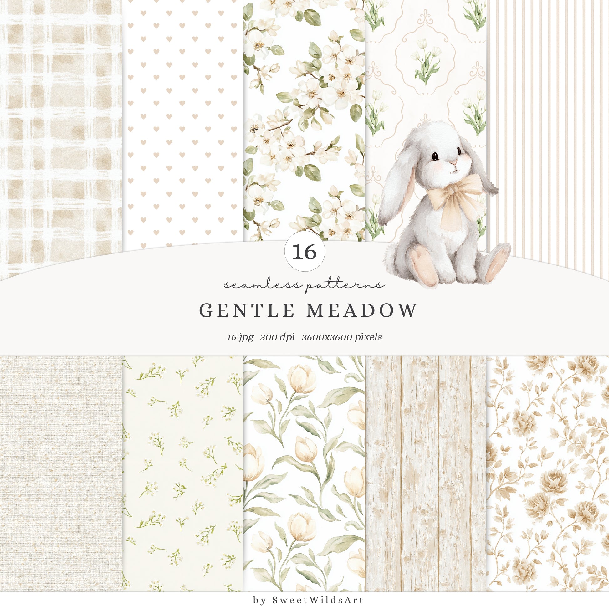 Gentle Meadow - Seamless Patterns, Spring Floral, Neutral Gingham Pattern, Pastel Papers, Nursery | 16 JPEG