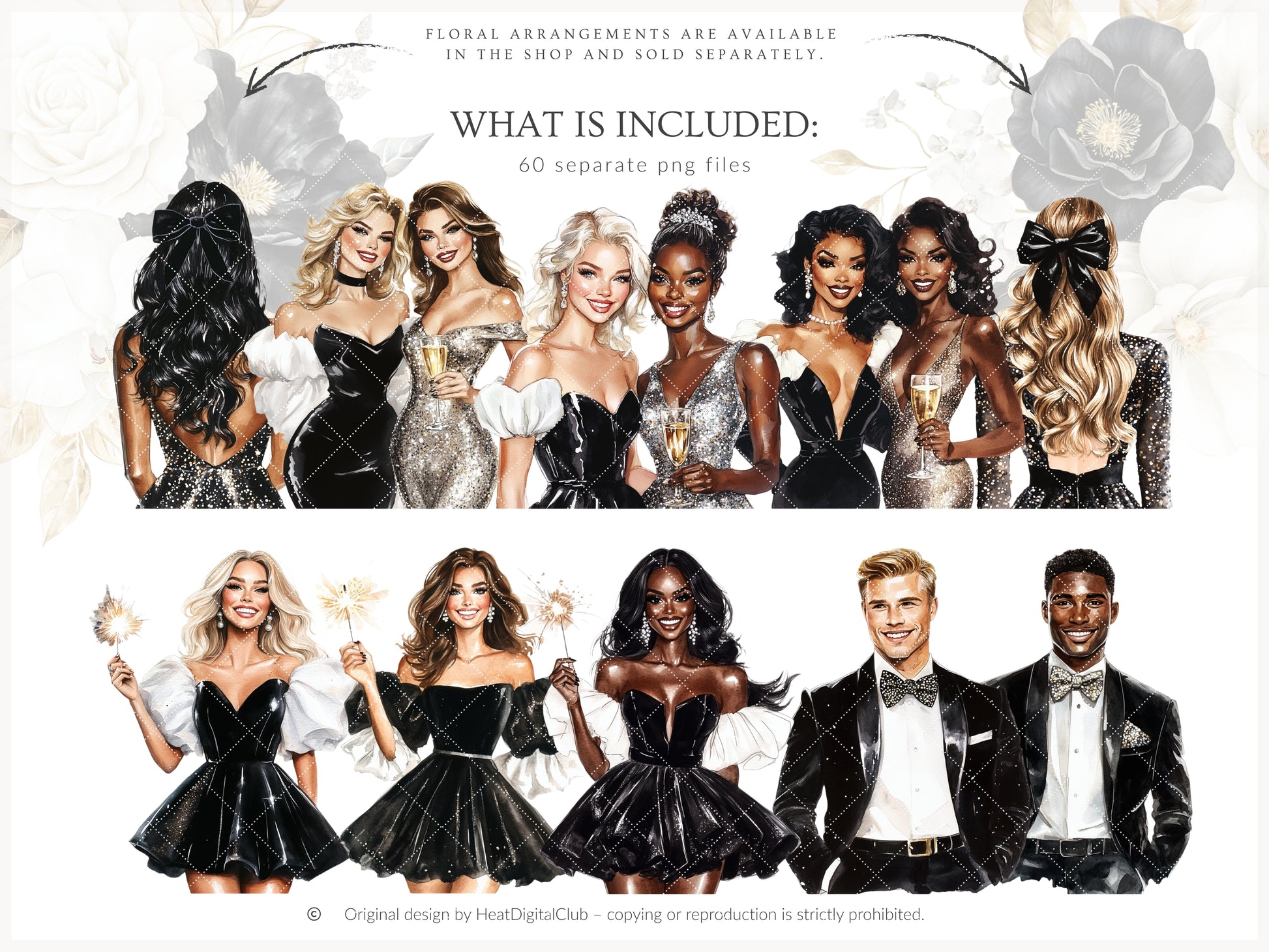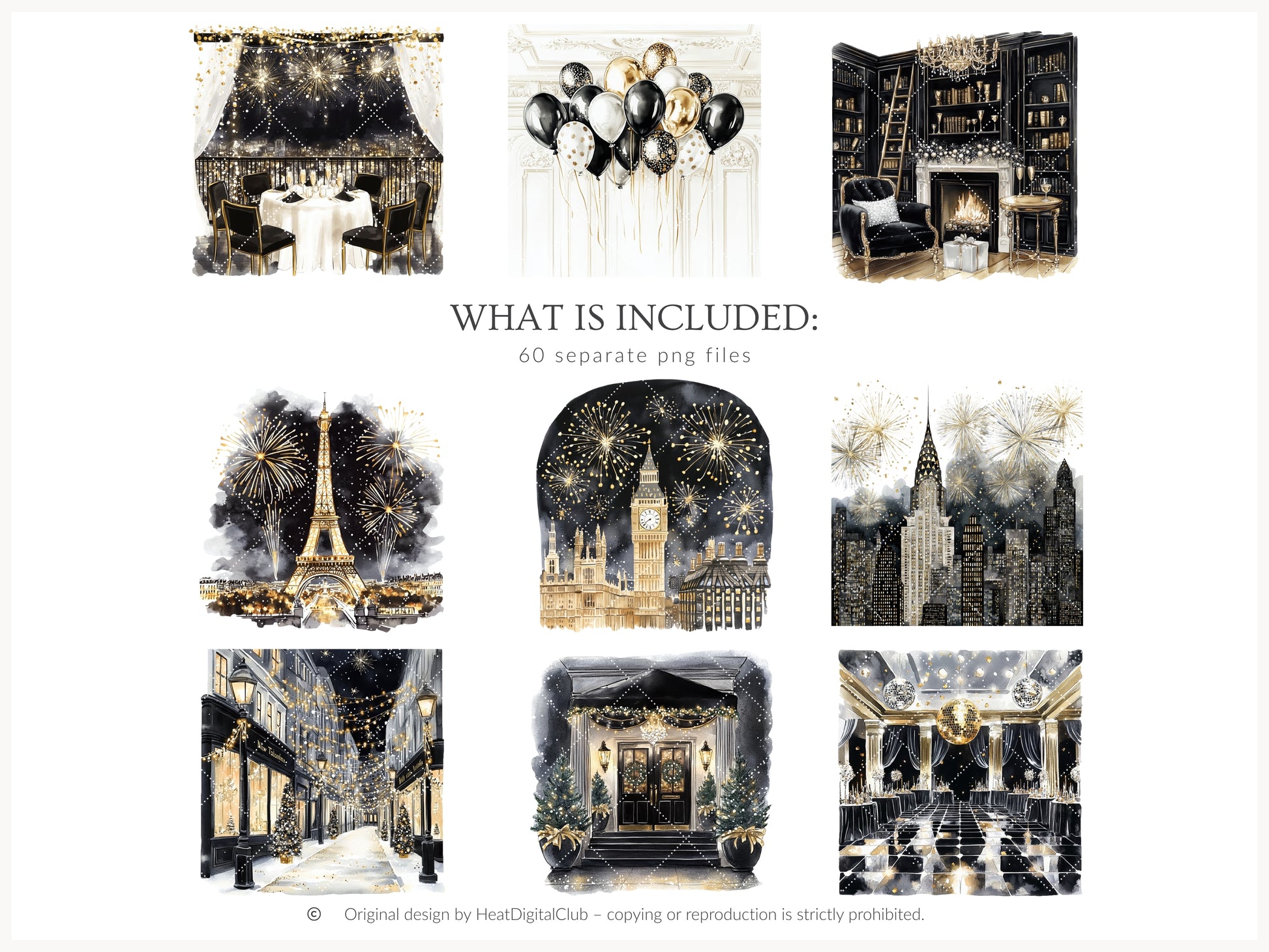 Happy New Year - Collection Bundle, Black Gold Silver Party, Holiday | 90 PNG/JPEG
