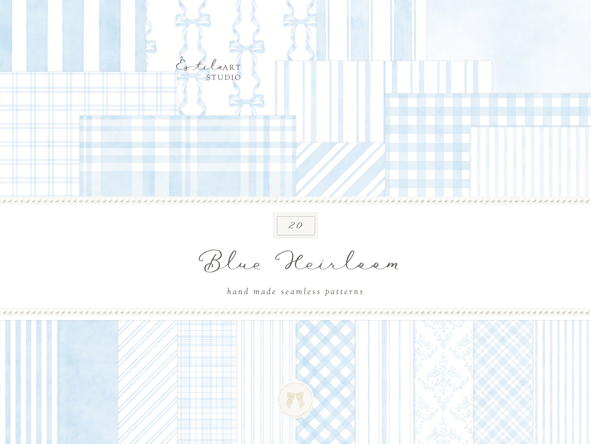 Blue Heirloom - Seamless Patterns, Classic Stripe Gingham Damask Bows, Elegant Digital Paper | 20 JPEG