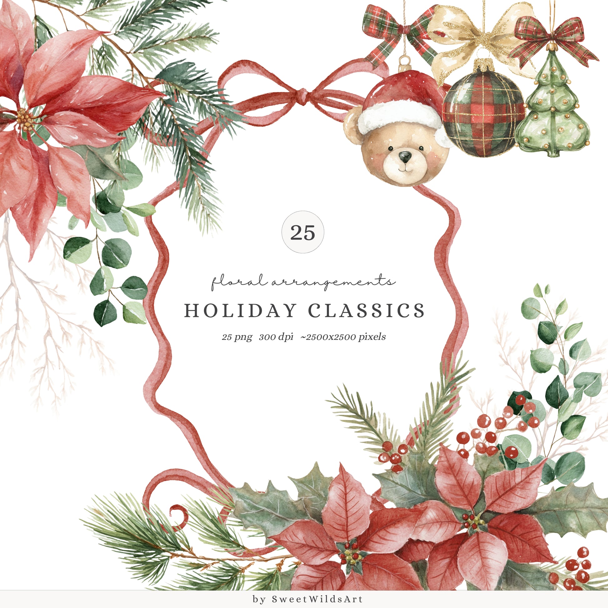 Holiday Classics - Floral Arrangements Clipart, Poinsettia, Evergreen, Christmas | 25 PNG
