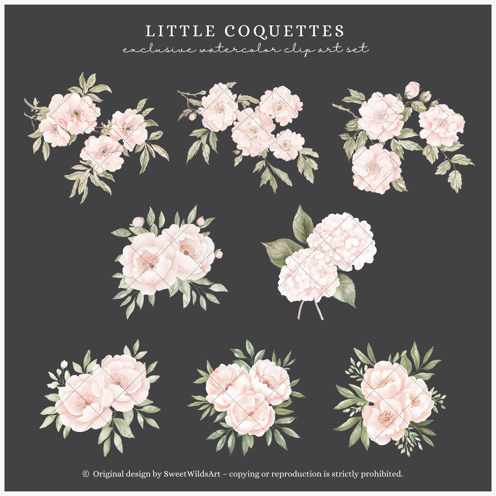 Capture delicate beauty with the Little Coquettes floral compositions — watercolor bouquets perfect for soft, romantic projects.