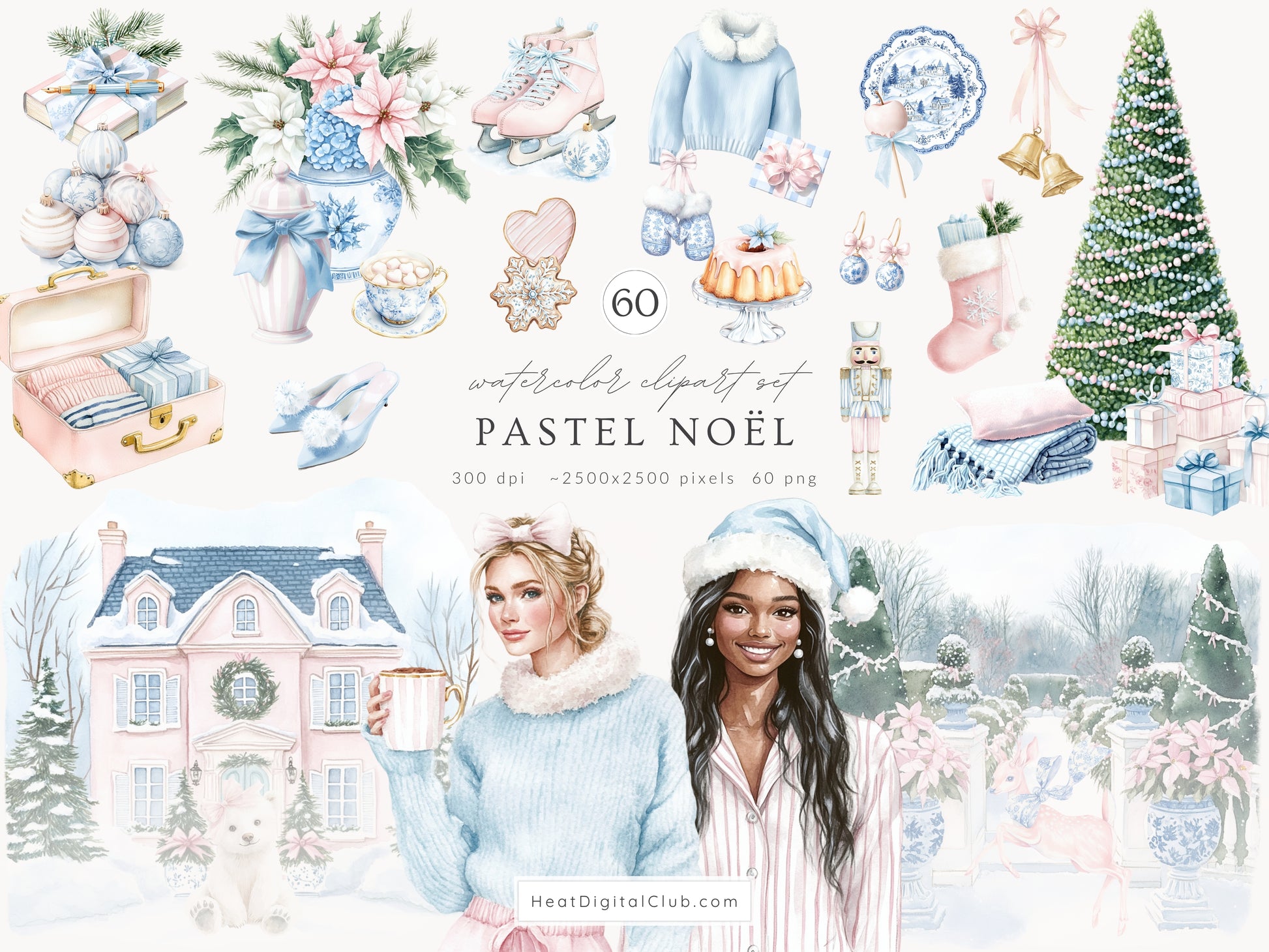 Pastel Noël - Christmas Clipart Bundle, Elegant Grandmillennial, Pink & Blue Holiday | 94 PNG/JPEG