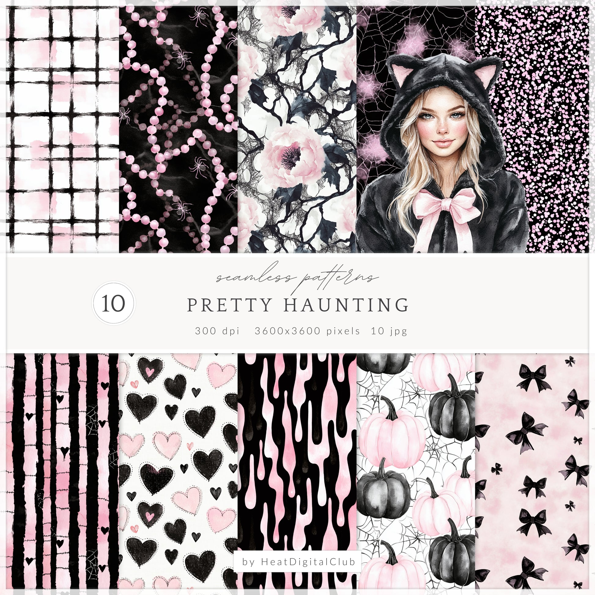 Pretty Haunting - Seamless Patterns, Black & Pink Gothic Halloween, Spooky | 10 JPEG