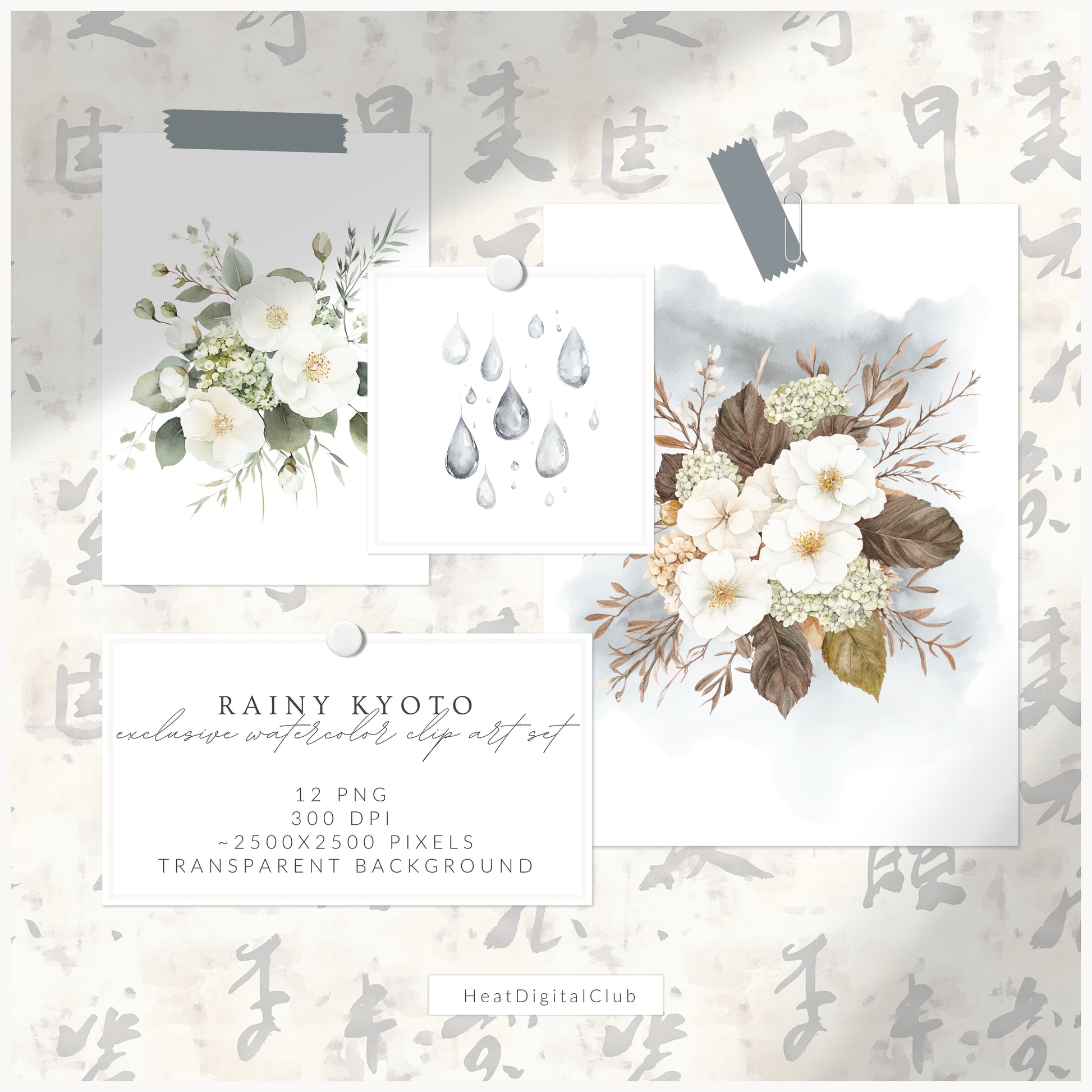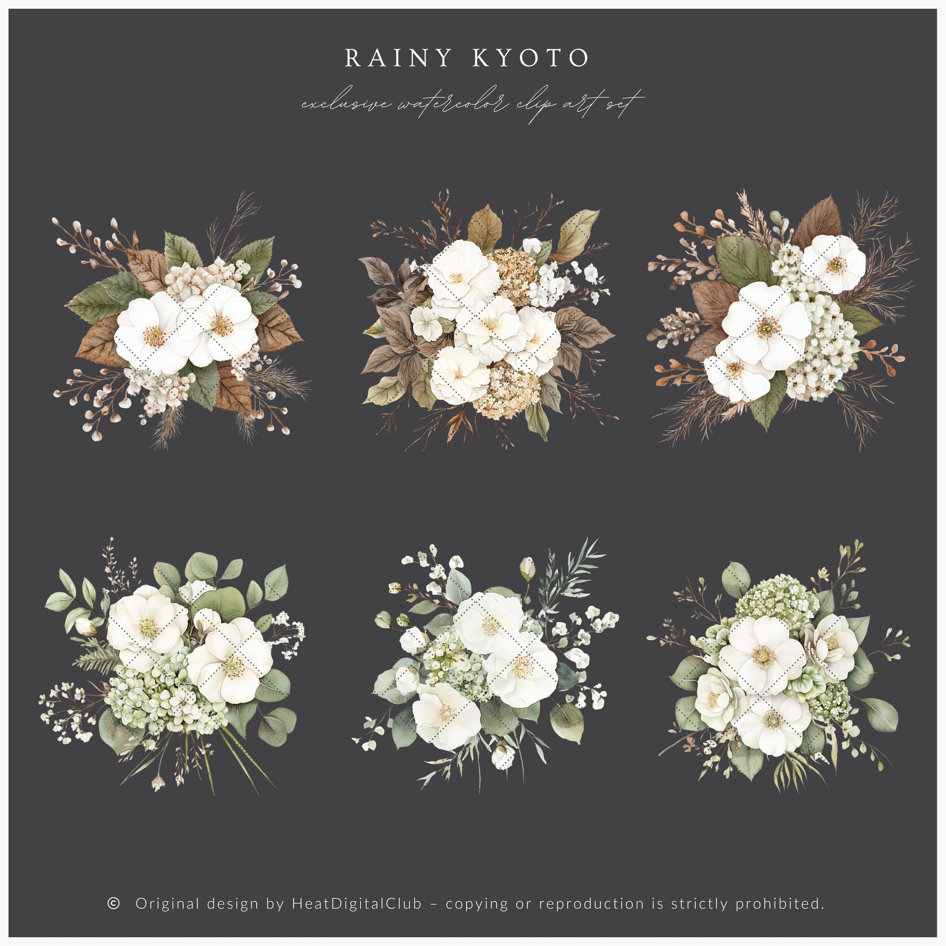 Capture delicate beauty with the Rainy Kyoto floral compositions — watercolor bouquets perfect for soft, romantic projects.