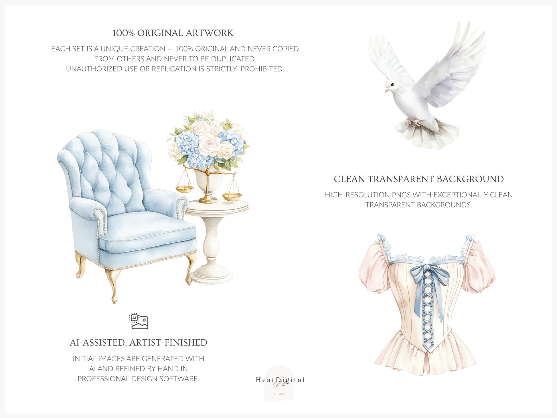 Most artwork in this collection was created with the help of AI program and thoughtfully refined using professional graphic design tools.
