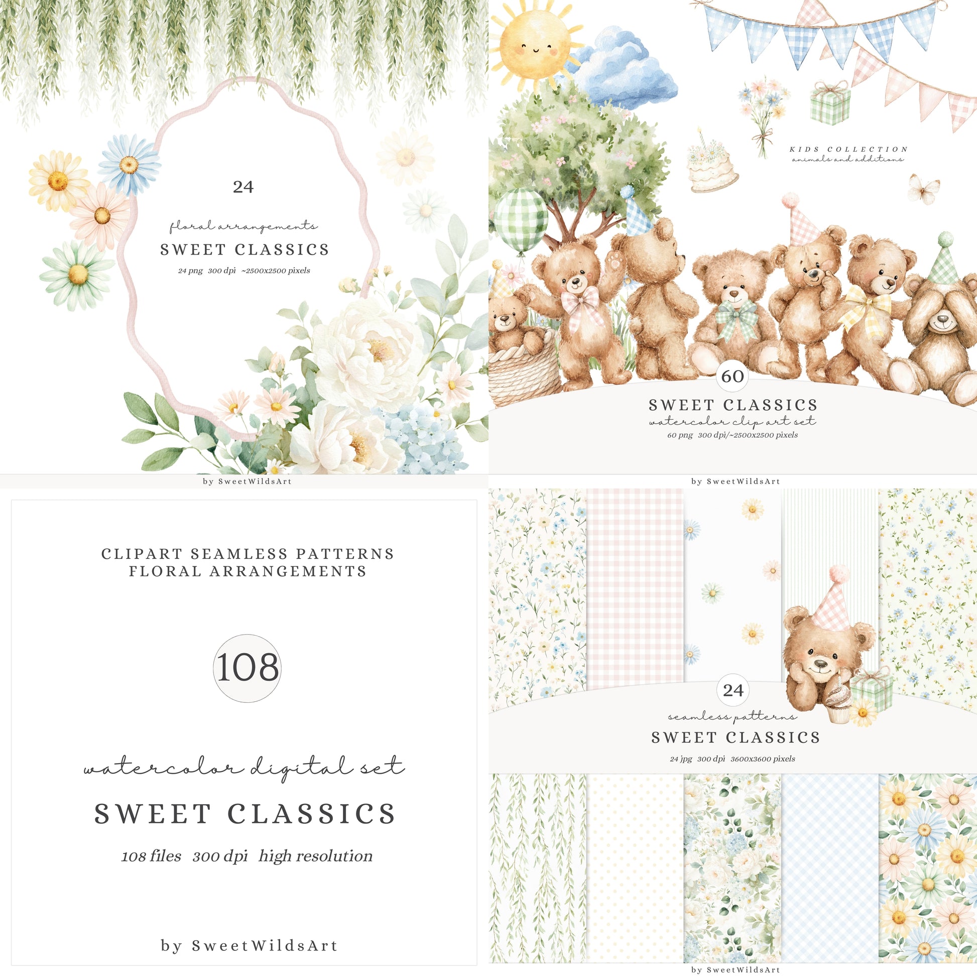 The complete Sweet Classics collection — clipart, floral compositions, and seamless patterns, thoughtfully created to work together in harmony and elevate your design experience.