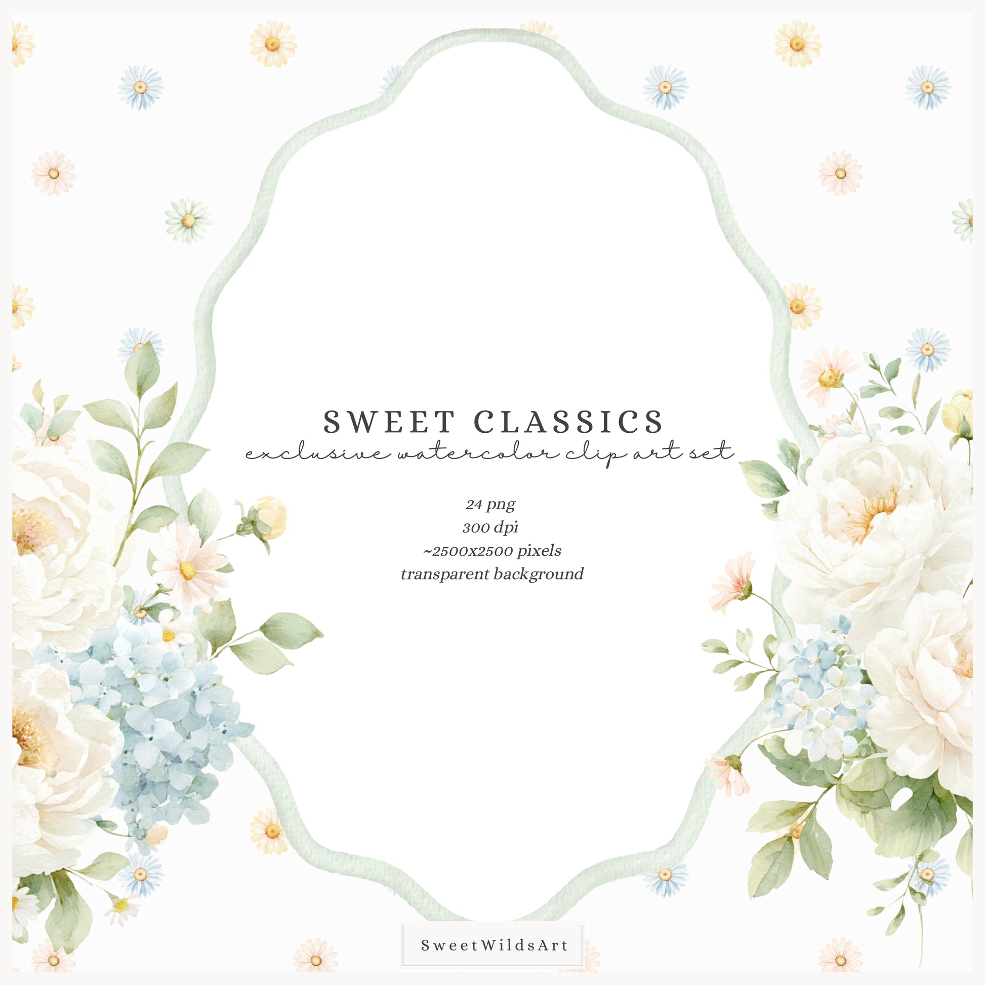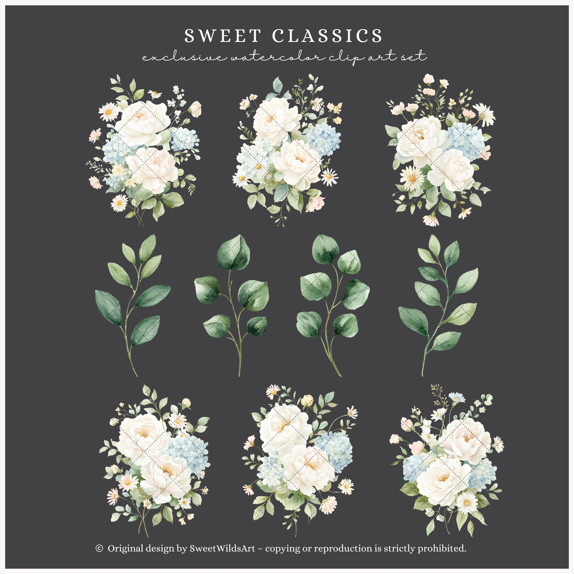 Capture delicate beauty with the Sweet Classics floral compositions — watercolor bouquets perfect for soft, romantic projects.