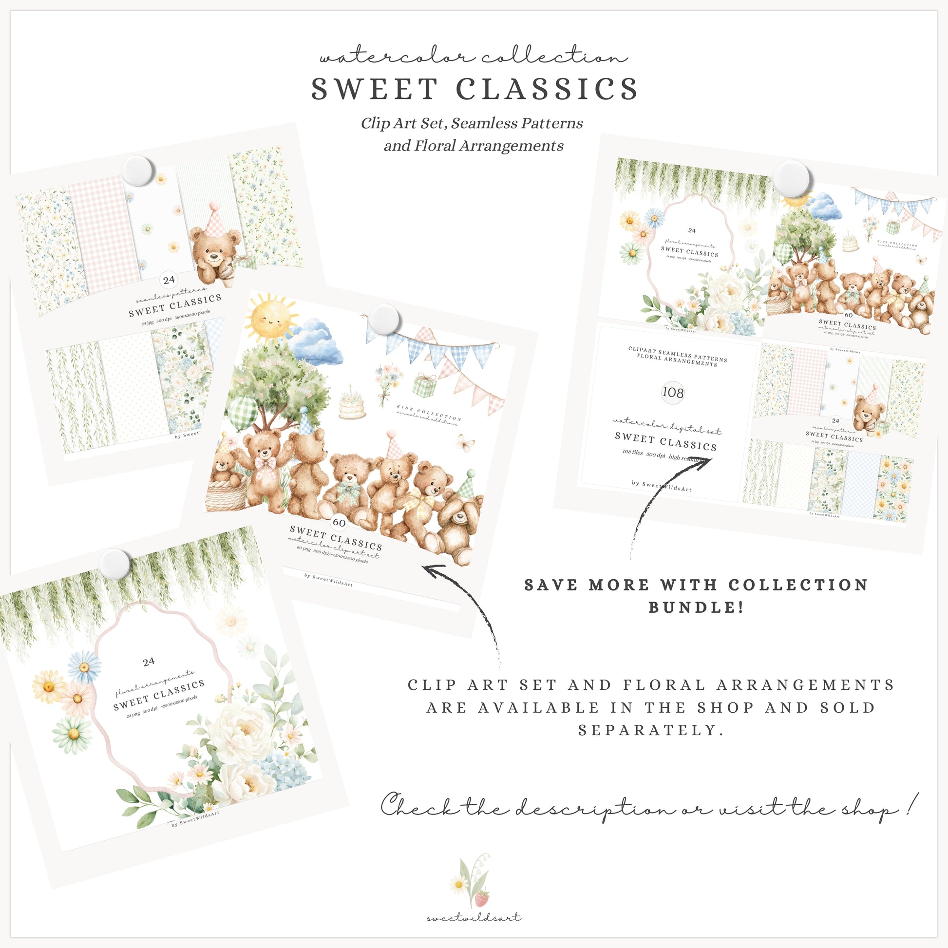 • You can purchase the clipart, patterns, and florals separately — or save by getting the full collection bundle.