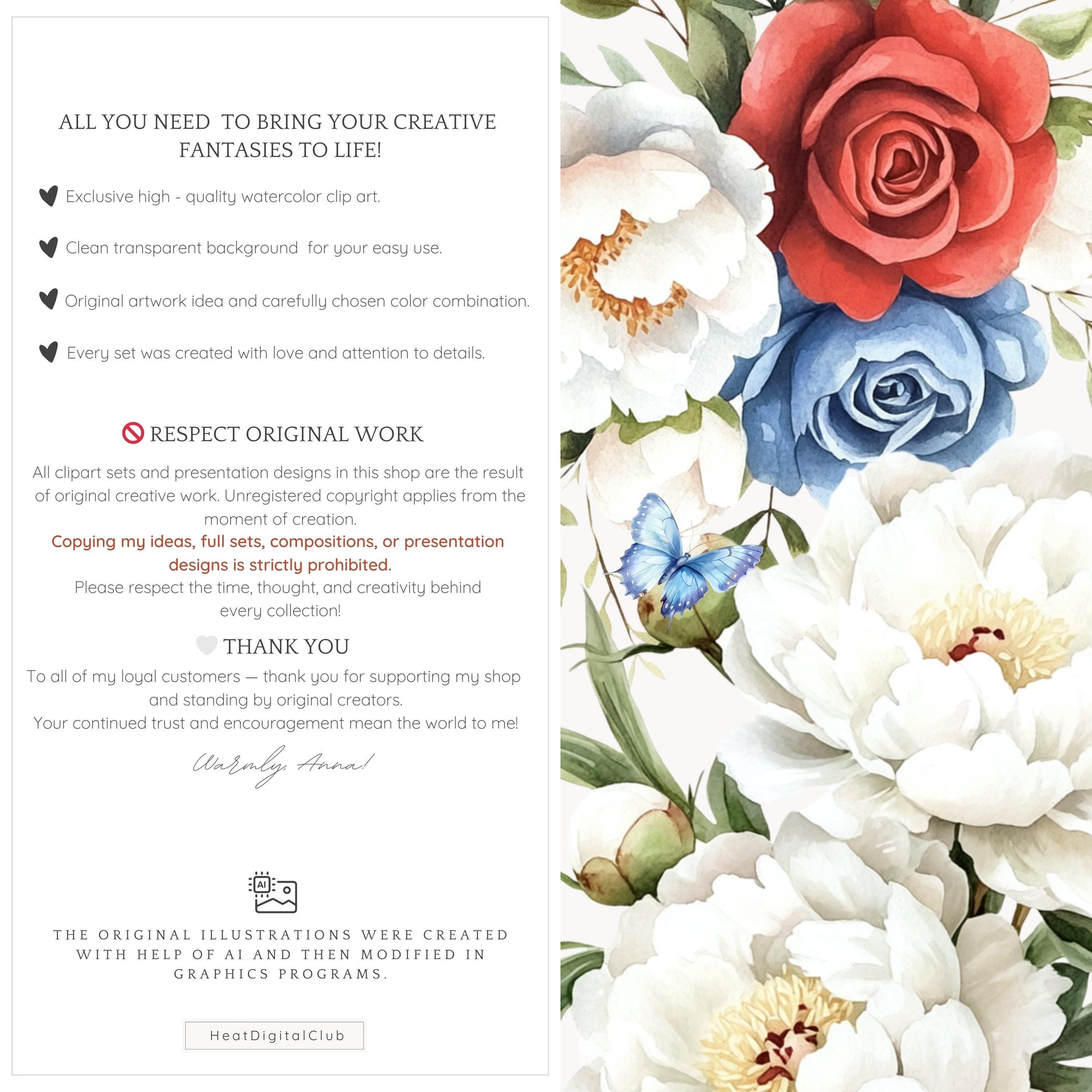 Americana Girl – Watercolor Florals, Red, White & Blue | 12 PNG
