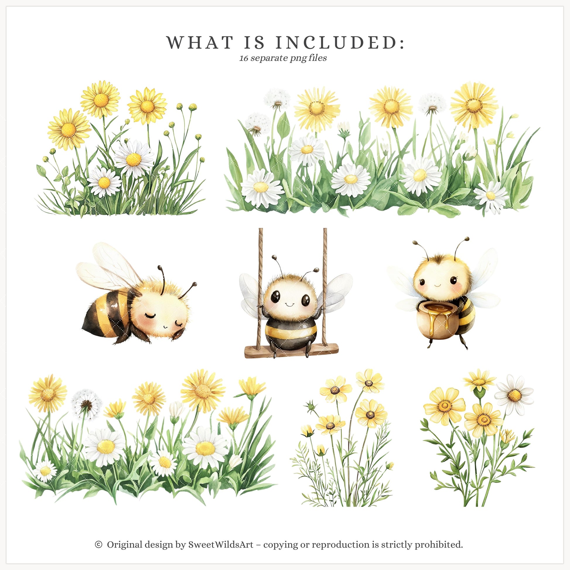 Honey Garden - Floral Arrangements, Daisies, Dandelions, Bees and Honey | 16 PNG