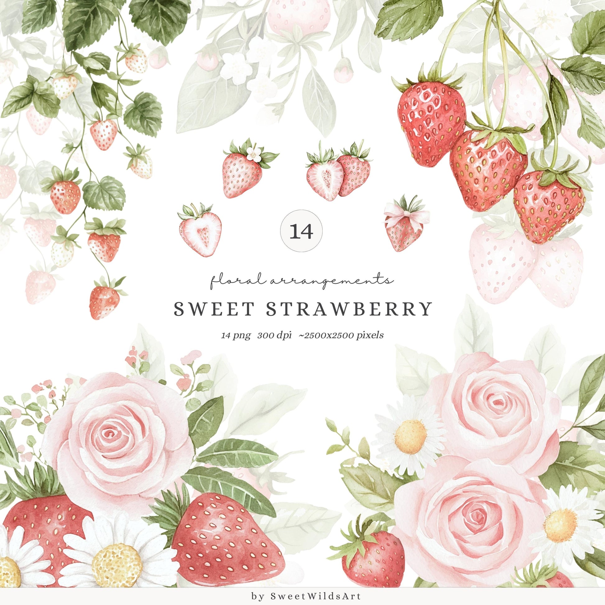 Capture delicate beauty with the Sweet Strawberry floral compositions — watercolor bouquets and overhead views perfect for soft, romantic projects.