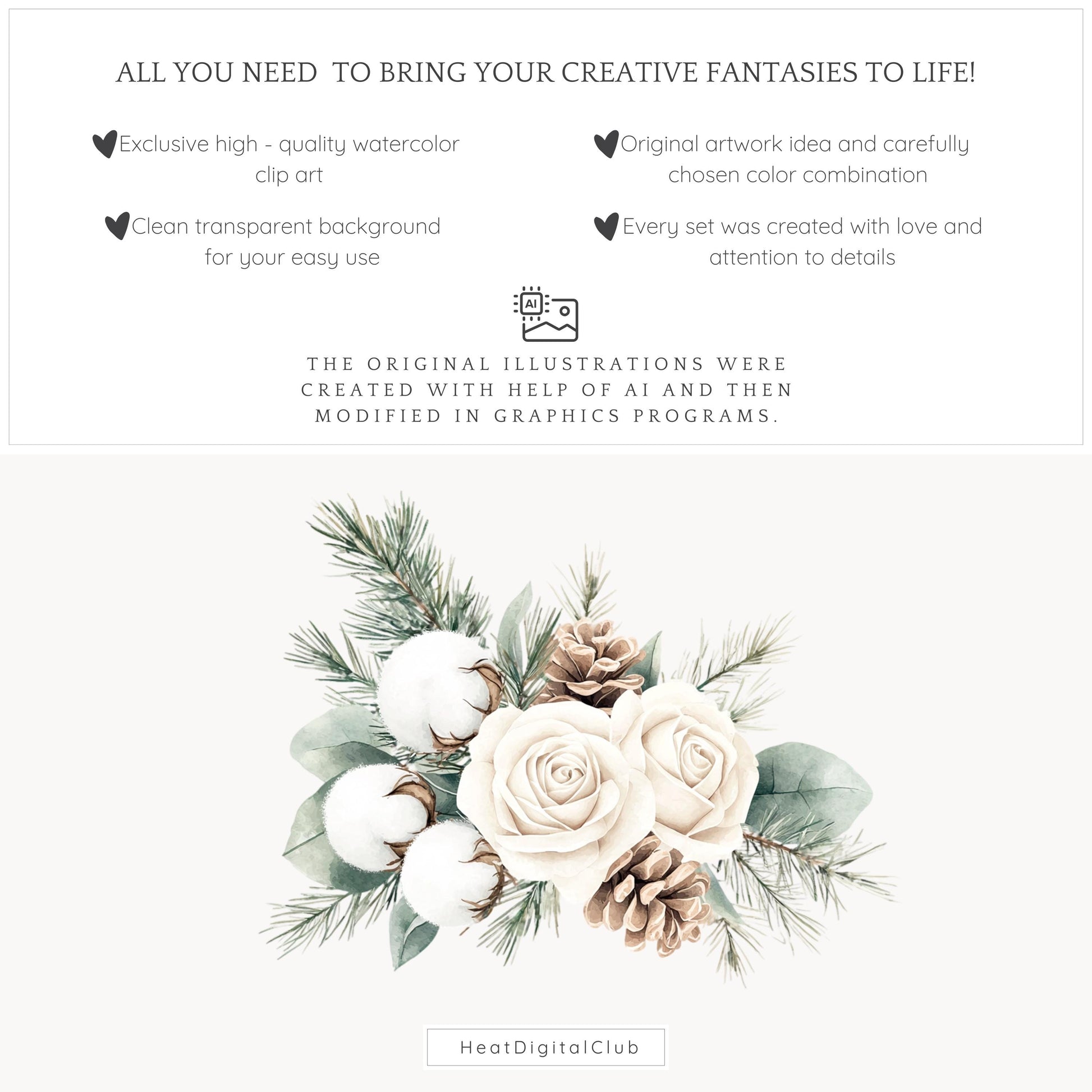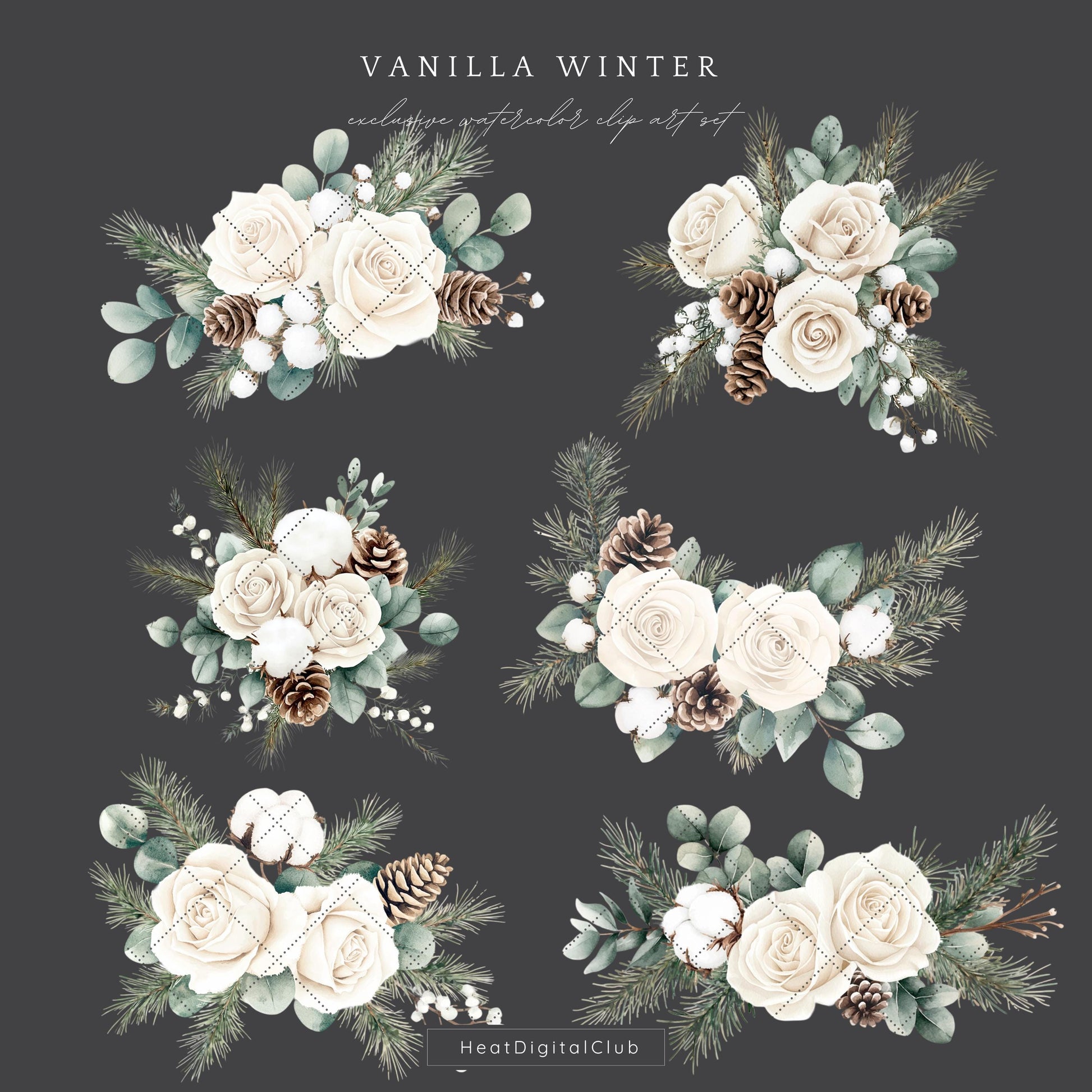 Capture delicate beauty with the Vanilla Winter floral compositions — watercolor bouquets perfect for soft, romantic projects.