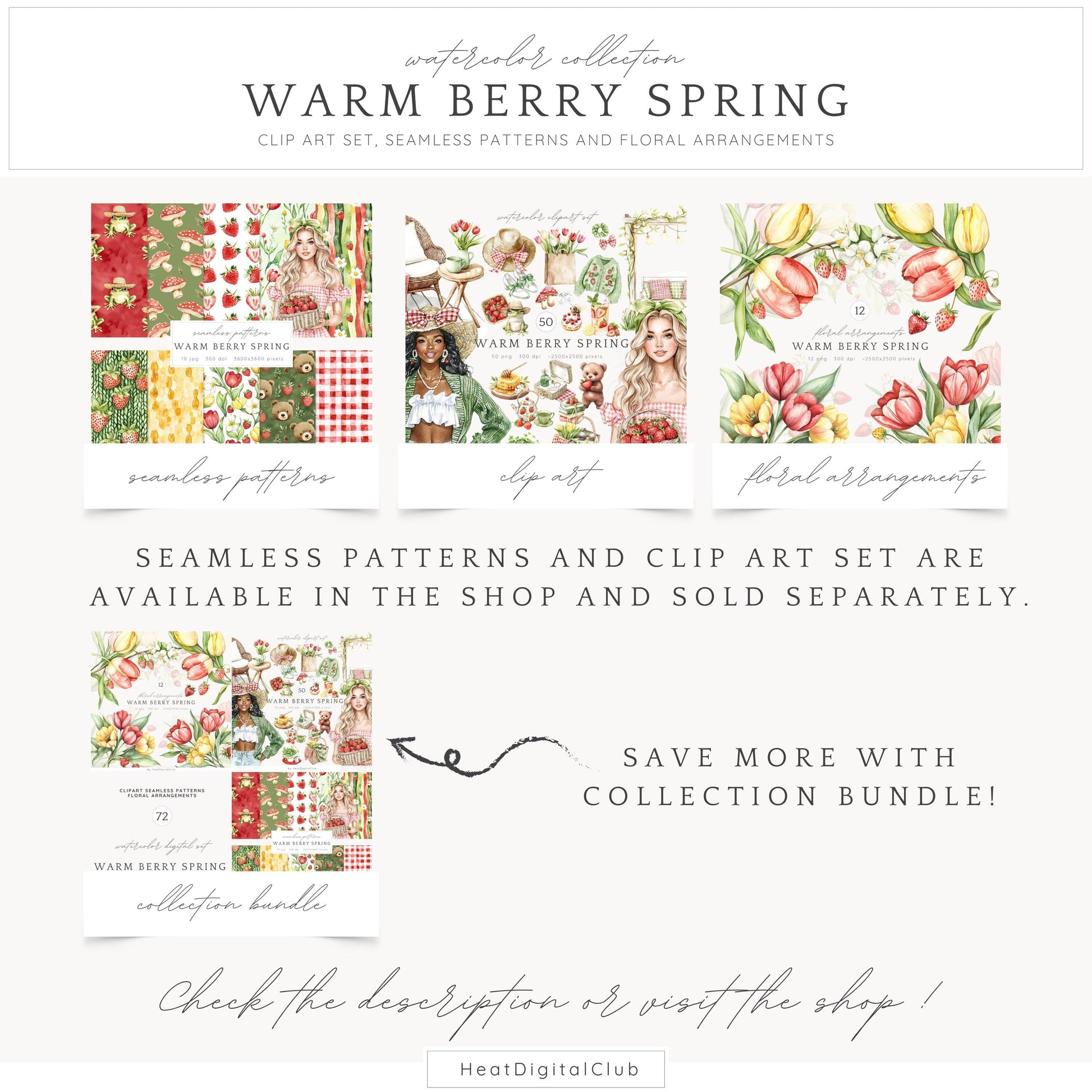 • You can purchase the clipart, patterns, and florals separately — or save by getting the full collection bundle.