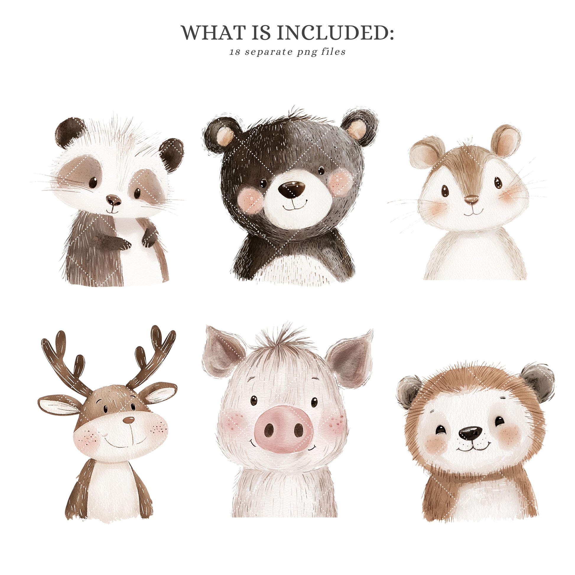Woodland Portraits - Cute Animals Clipart, Baby Shower, Nursery, Boho Forest | 18 PNG