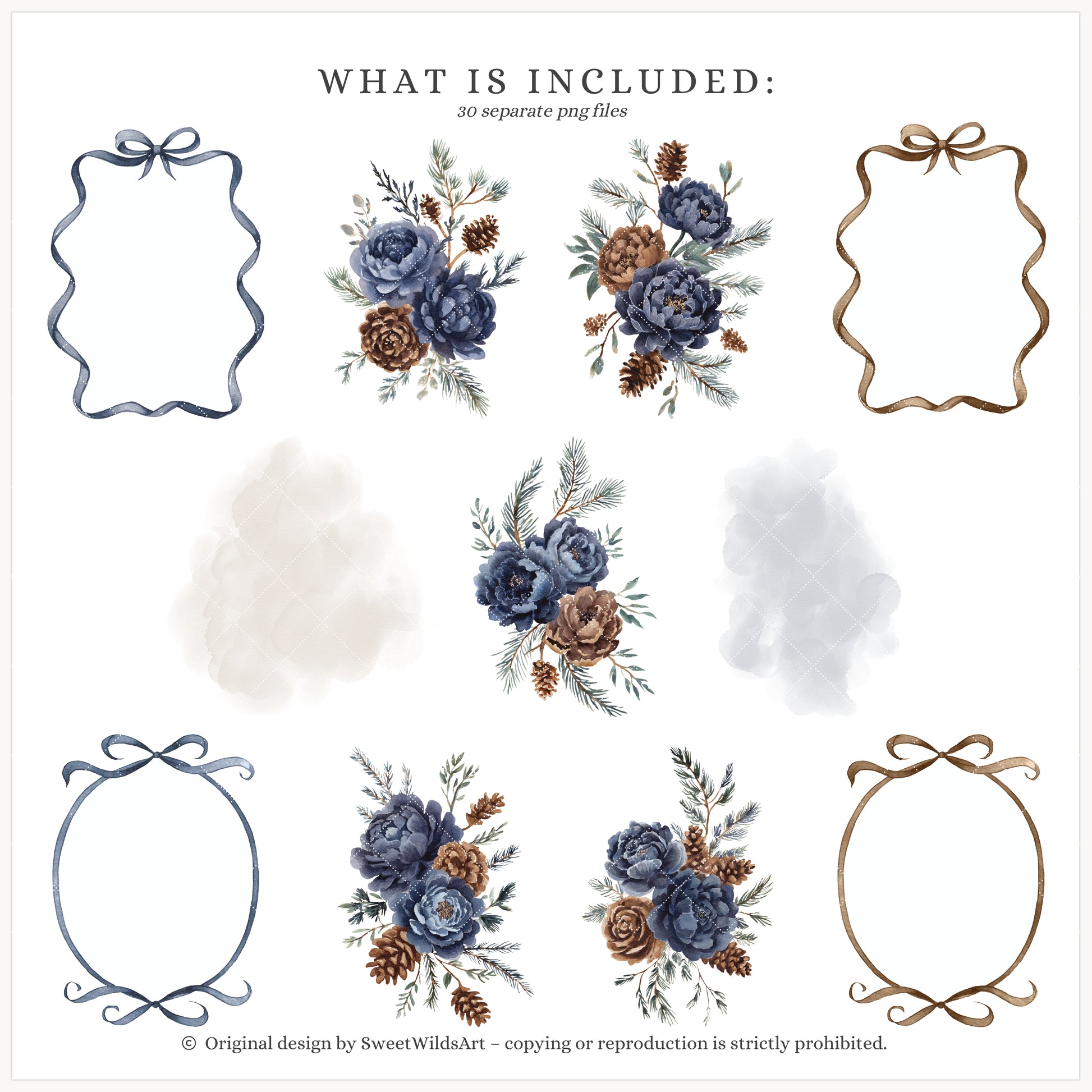 Winter Classics - Floral Arrangements Clipart, Blue Brown Peonies, Snowy Greenery | 30 PNG