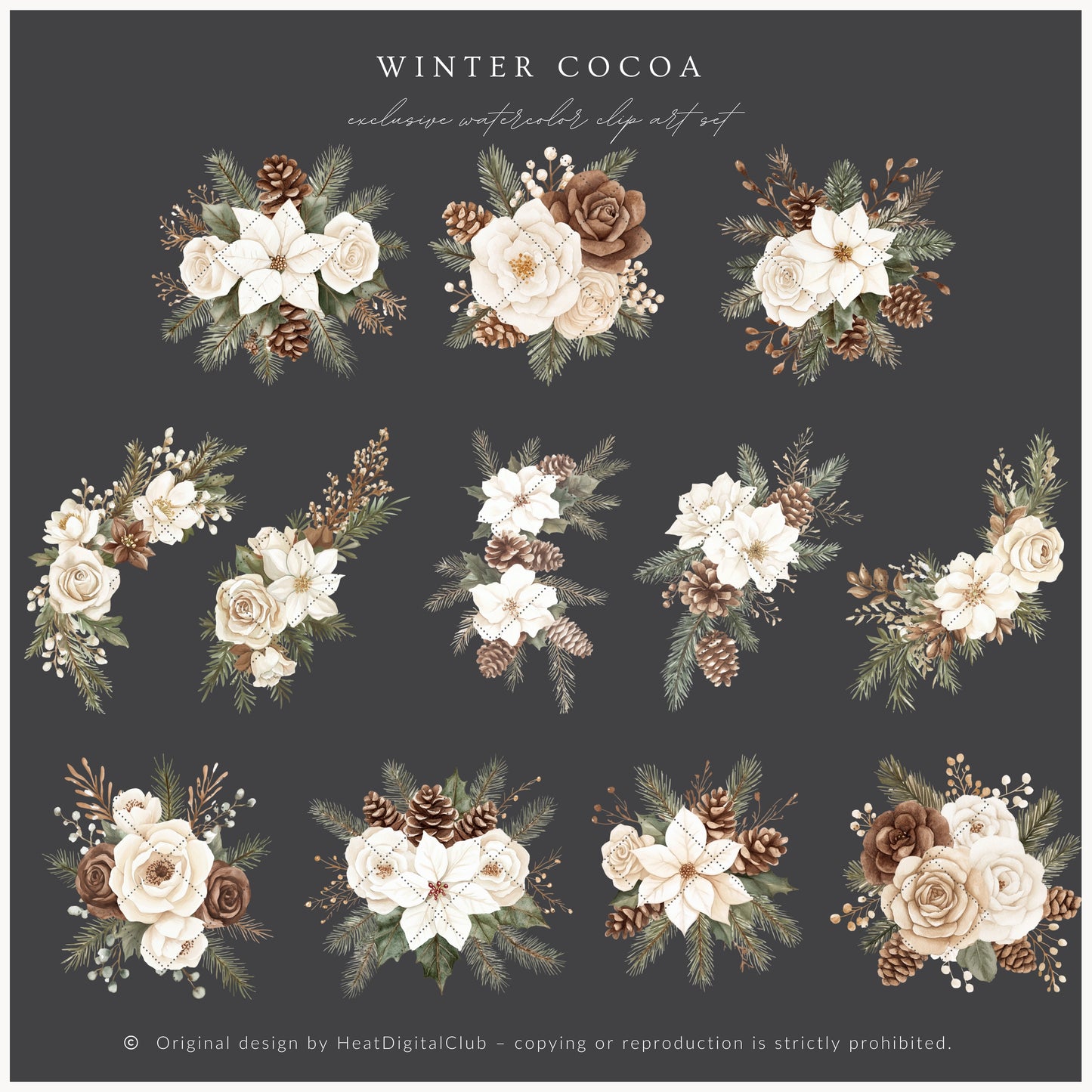 Capture delicate beauty with the Winter Cocoa floral compositions — watercolor bouquets perfect for soft, romantic projects.