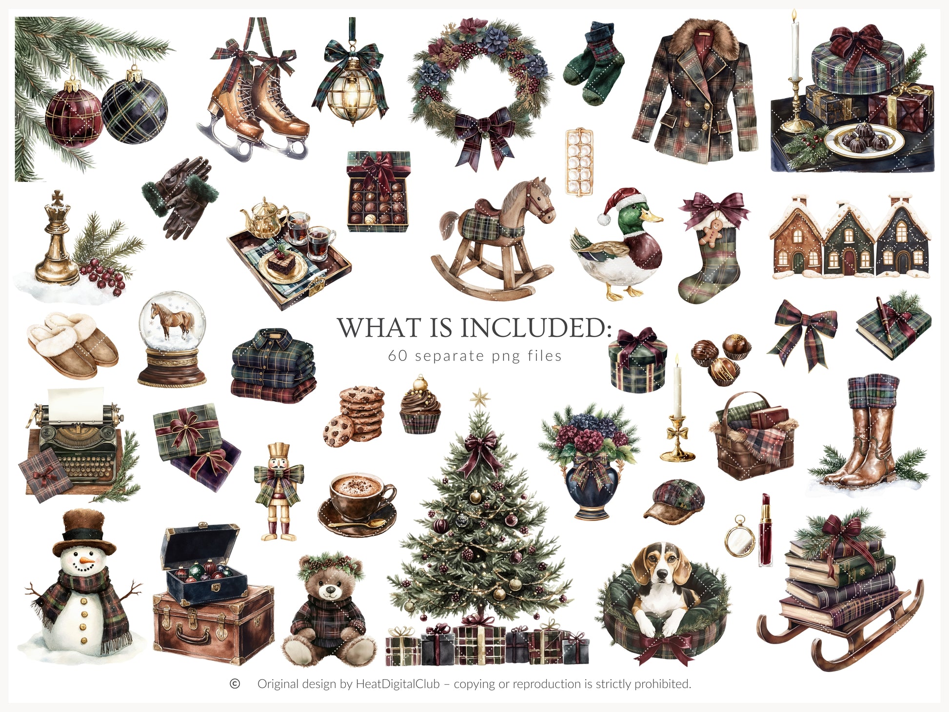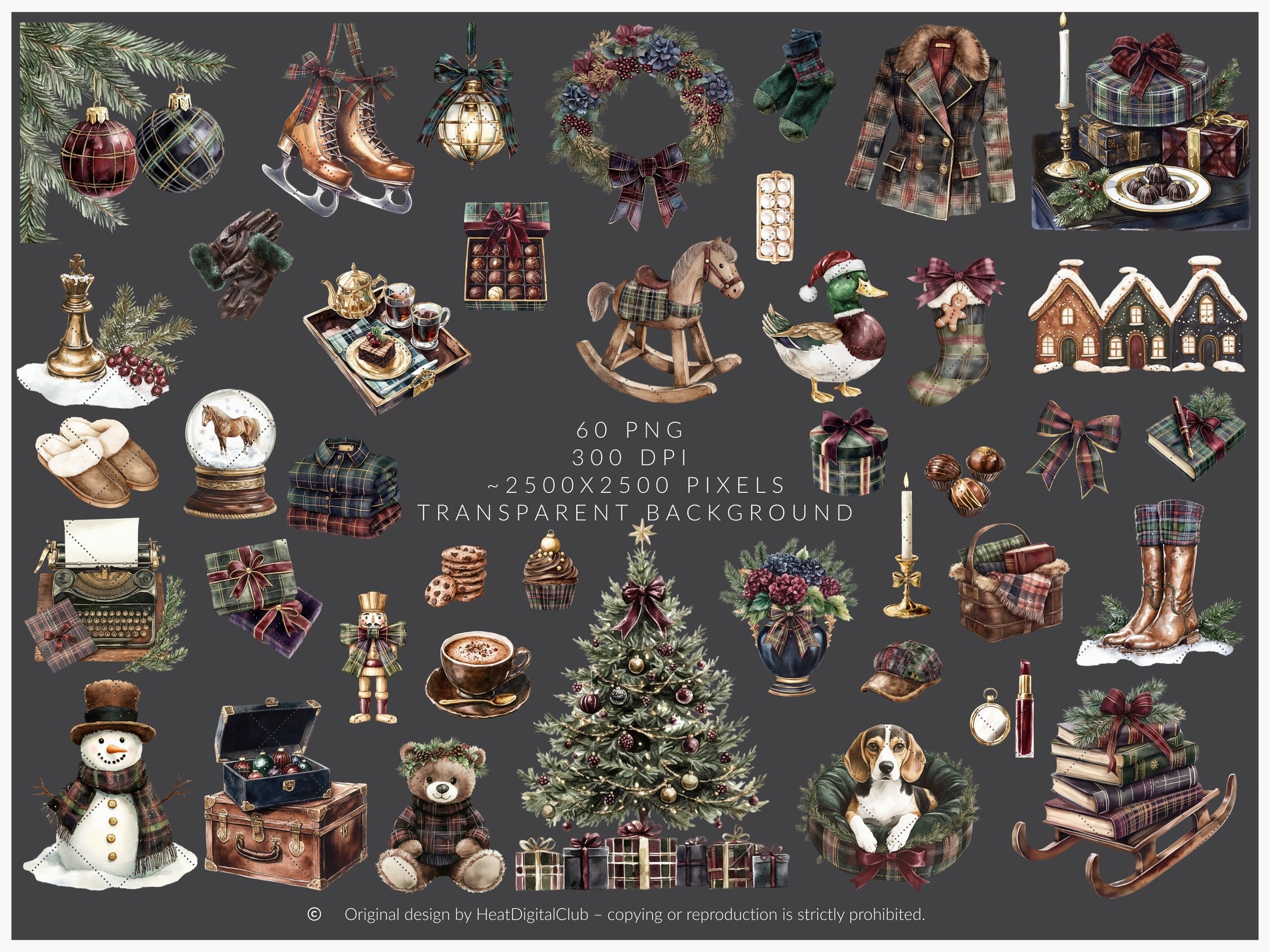 Winter Elegance - Watercolor Clipart, Aristocratic Christmas, Tartan Holiday | 60 PNG