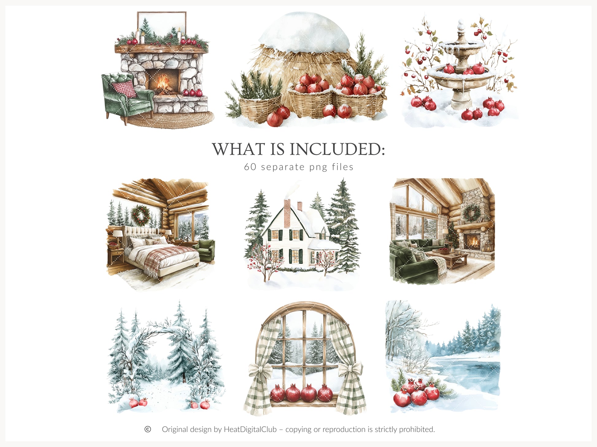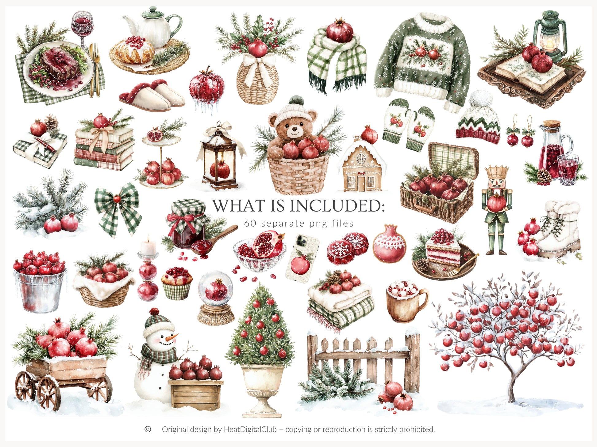 Winter Pomegranate - Clipart Set, Holiday Fruits, Cozy, Rustic Xmas | 60 PNG